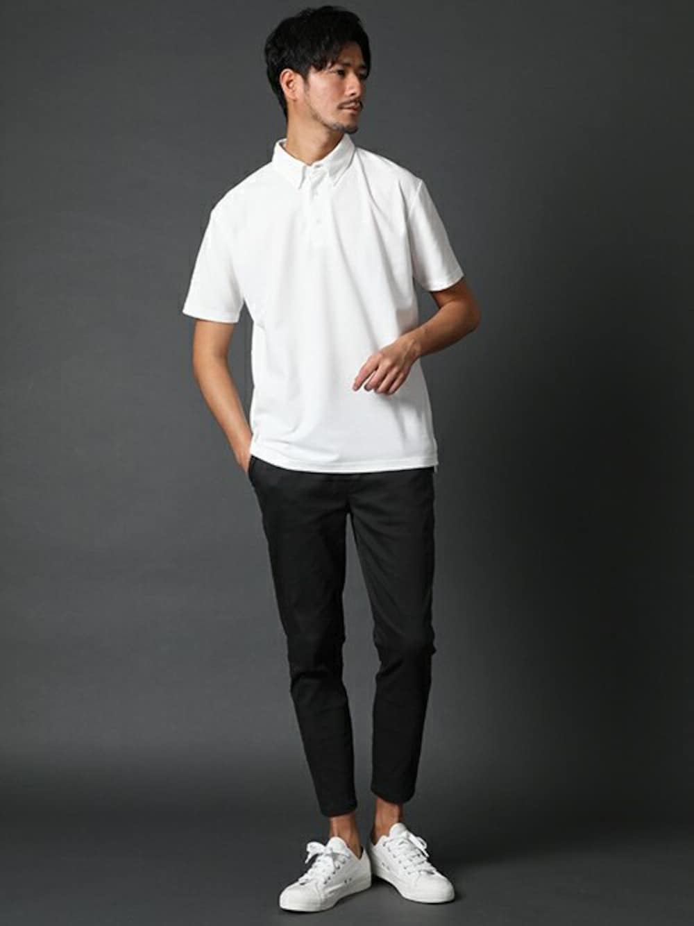 パンツ、ポロシャツともに接触冷感効果のある素材を使用したアイテム。 ポロシャツはボタンダウン仕様で襟に立体感が出てシャープな印象に。 パンツはガムのように伸びることからこの名前が付けられた『ガムストレッチ』素材。 キックバックに優れ、超伸縮性を持ったハイスペックマテリアル。ストレスフリーでスキニーのシルエットを楽しんでいただけます。 アンクルカットになっているので足首回りもスッキリな印象に。