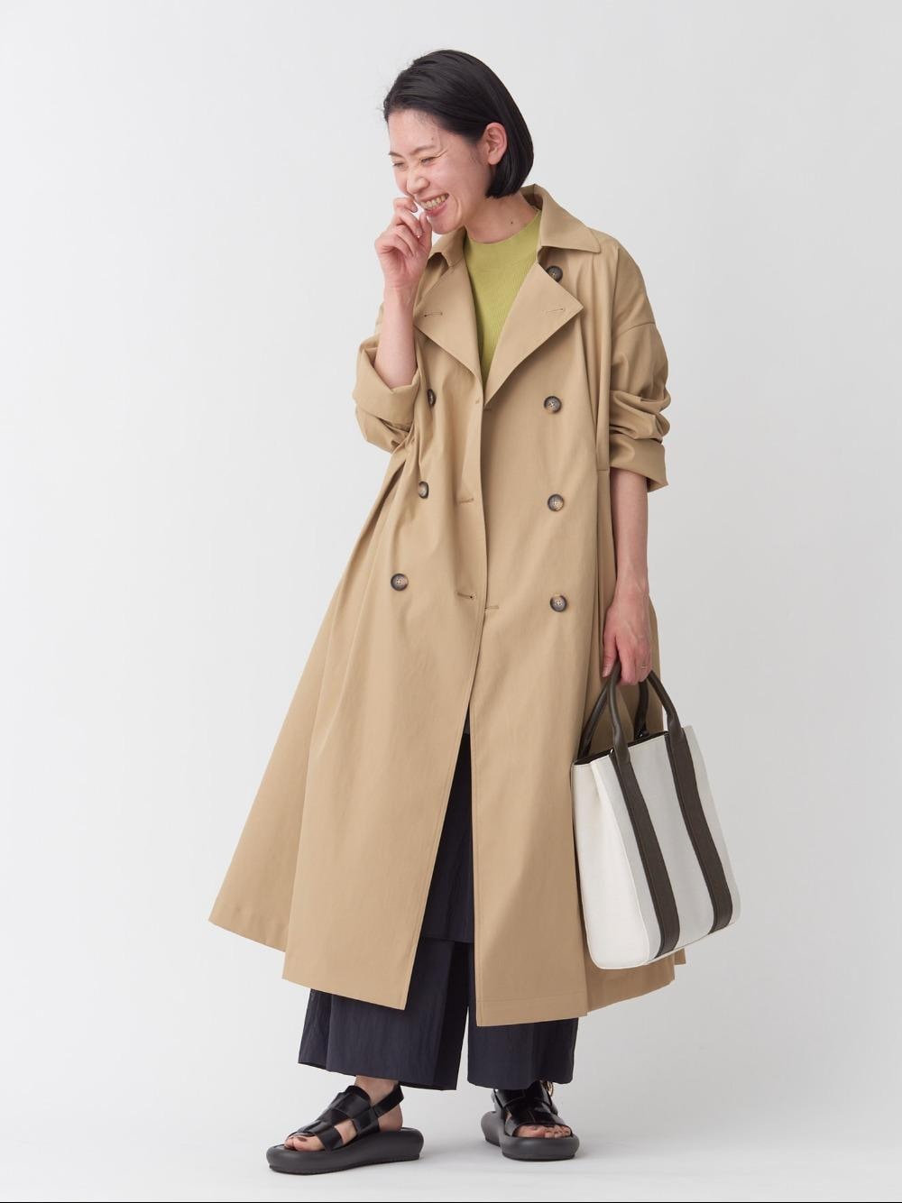 【30代/身長167cm/着用サイズ38】 パーソナルカラー:ブルべ冬 骨格:ストレート 急に暖かくなってきたので、いよいよスプリングコートの出番です! シルエットのキレイなボリュームたっぷりのトレンチコートは、定番のベージュを選びました。 どんなアイテムとも好相性、さっと羽織ってスタイリングが完成するのが、トレンチコートの嬉しいポイントです。 しっかりと着丈があり、高身長の私でもバランス良く着用出来ました。 春なので、インナーにはピスタチオグリーンのワッフルニットを合わせて、軽やかな色味に仕上げました。