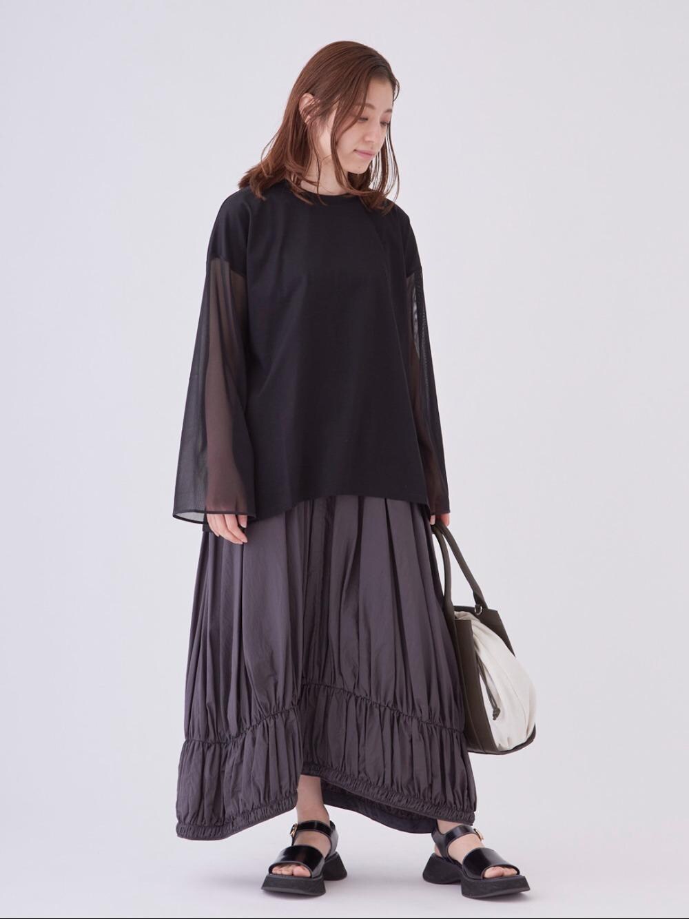 年齢:30代/普段サイズ:36/着用サイズ:38(カットソー)36(スカート) チュール切り替えになったカットソーと軽やかなナイロン素材のスカートで、ダークトーンでも春らしい印象に。 デザイン性の高いアイテムがゆるっとしたスタイリングにモード感をプラスしてくれます。