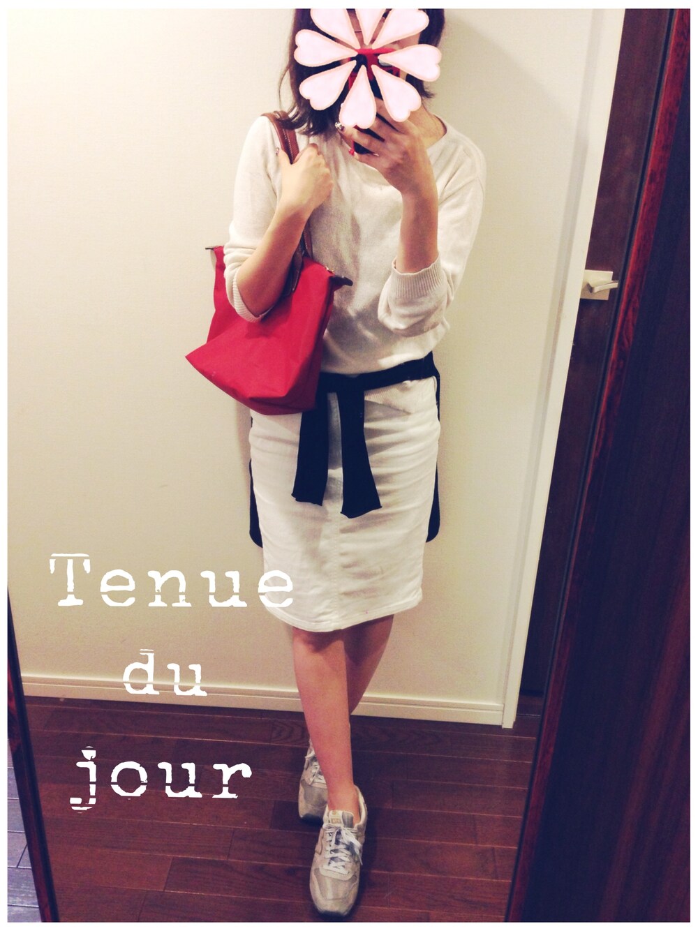 ホワイトニット&ホワイトスカートにブラックのカーディガンをまいてポイントに。 赤のロンシャントートを差し色にしました☺︎