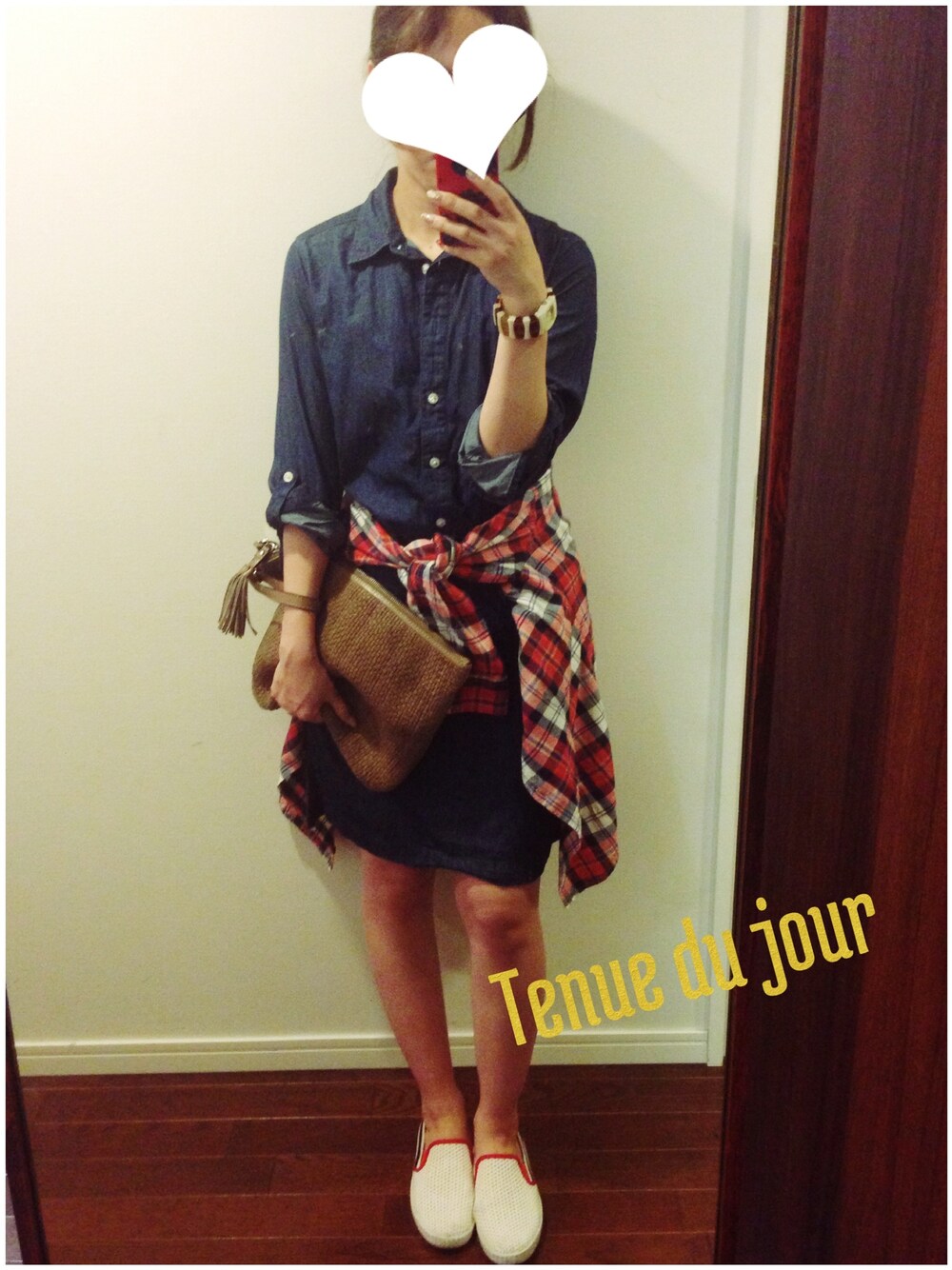 この季節に大活躍のシャツワンピのポイントに赤のチェックシャツを☺︎