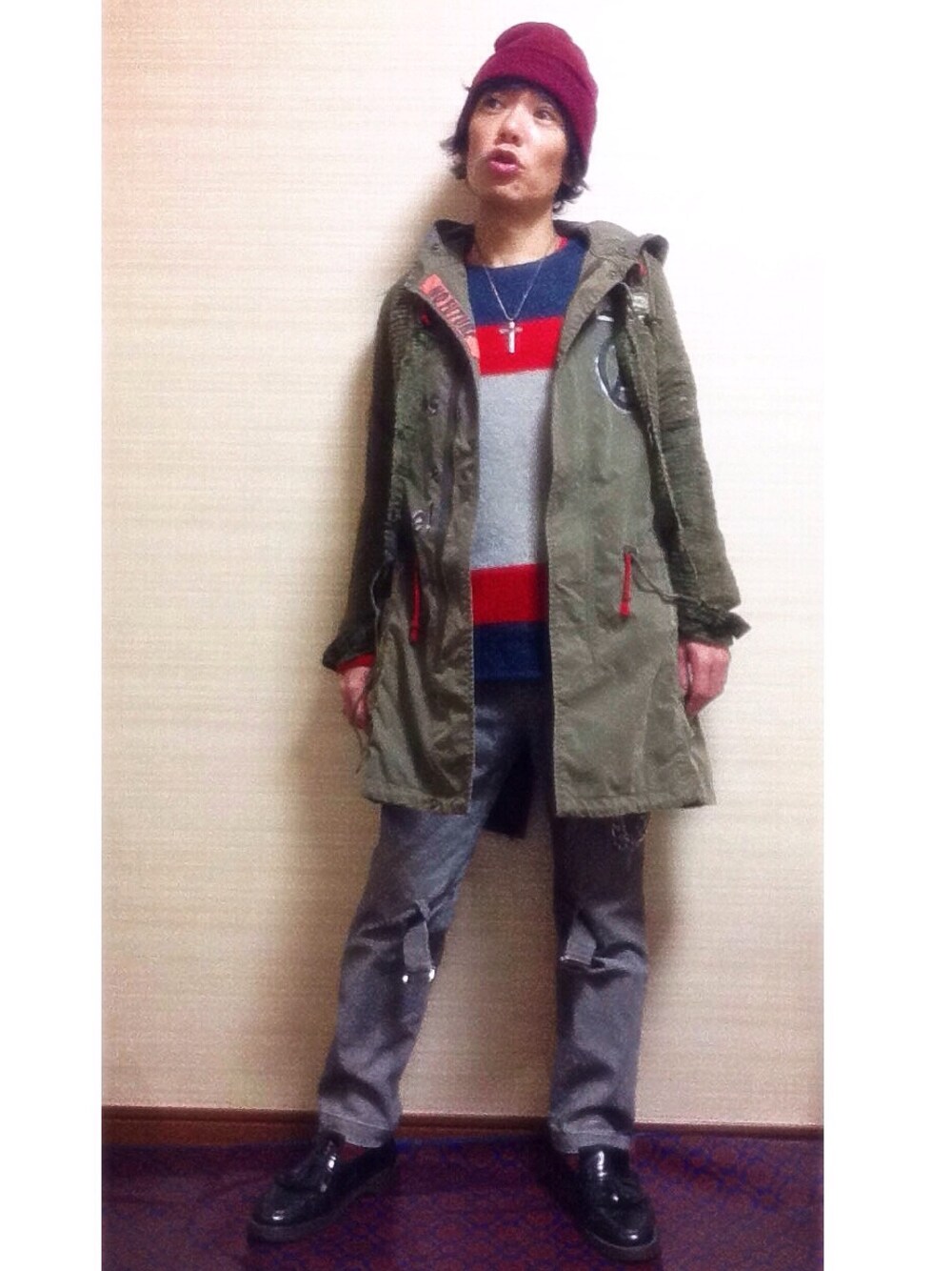 レッド系のニット/セーター、ブラック系のその他シューズを着用したメンズの冬コーディネートの1枚目の写真