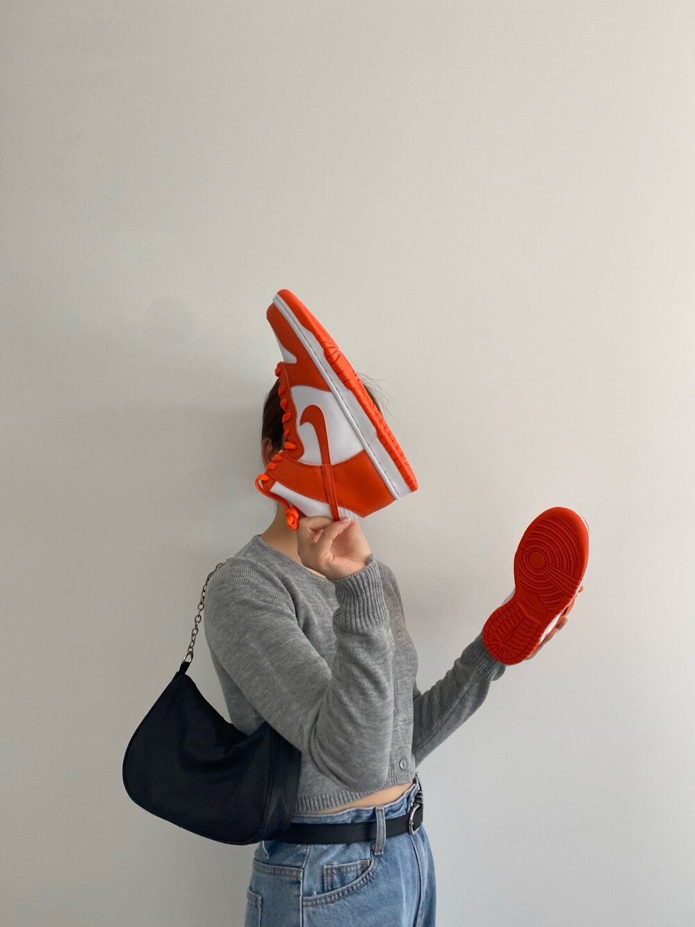 オレンジ系のスニーカーを着用したレディースの春コーディネートの1枚目の写真