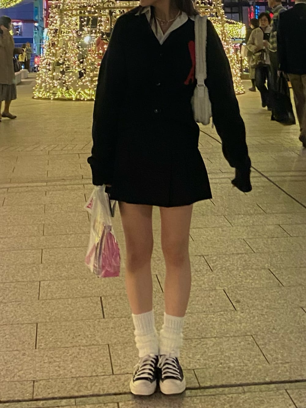 ブラック系のカーディガン/ボレロ、ブラック系のスニーカー、ブラック系のスカートを着用したレディースの秋コーディネートの1枚目の写真