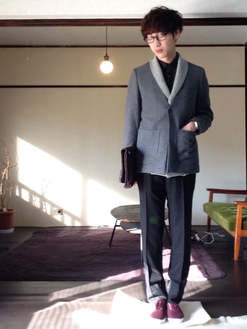 今日のタグはショールカラーということで、唯一の武器であるこのジャケットに再び出て来てもらいました。 くまなく探してもやはり相棒はこいつだけでした。 前回はオールグレー風にかなりきれいめに作ってみたので、今回はもう少し色を足してみました。 グリーンのチェックシャツが着たかったので中に入れ込んで、足元はボルドーのスニーカーです。 こちら、大人買いしました。1足1300円だから。 緑と紫をそれぞれダークなトーンで合わせる配色は僕の好きなものです。 ブラウンとネイビーも好きだけど、違う意味で好き。 ブラウンxネイビーは伝統、グリーンxパープルは主張。 だから本当はもっとグリーンが写ってくれたら伝わったけど、暗い色だからあまり伝えられませんでした。 スニーカーに光が当たって明るく見えます。 コンプレックスハーモニー。 興味がある方はコンプレックスハーモニーとナチュラルハーモニーを調べてみると、配色のことが一つ楽しくなります。
