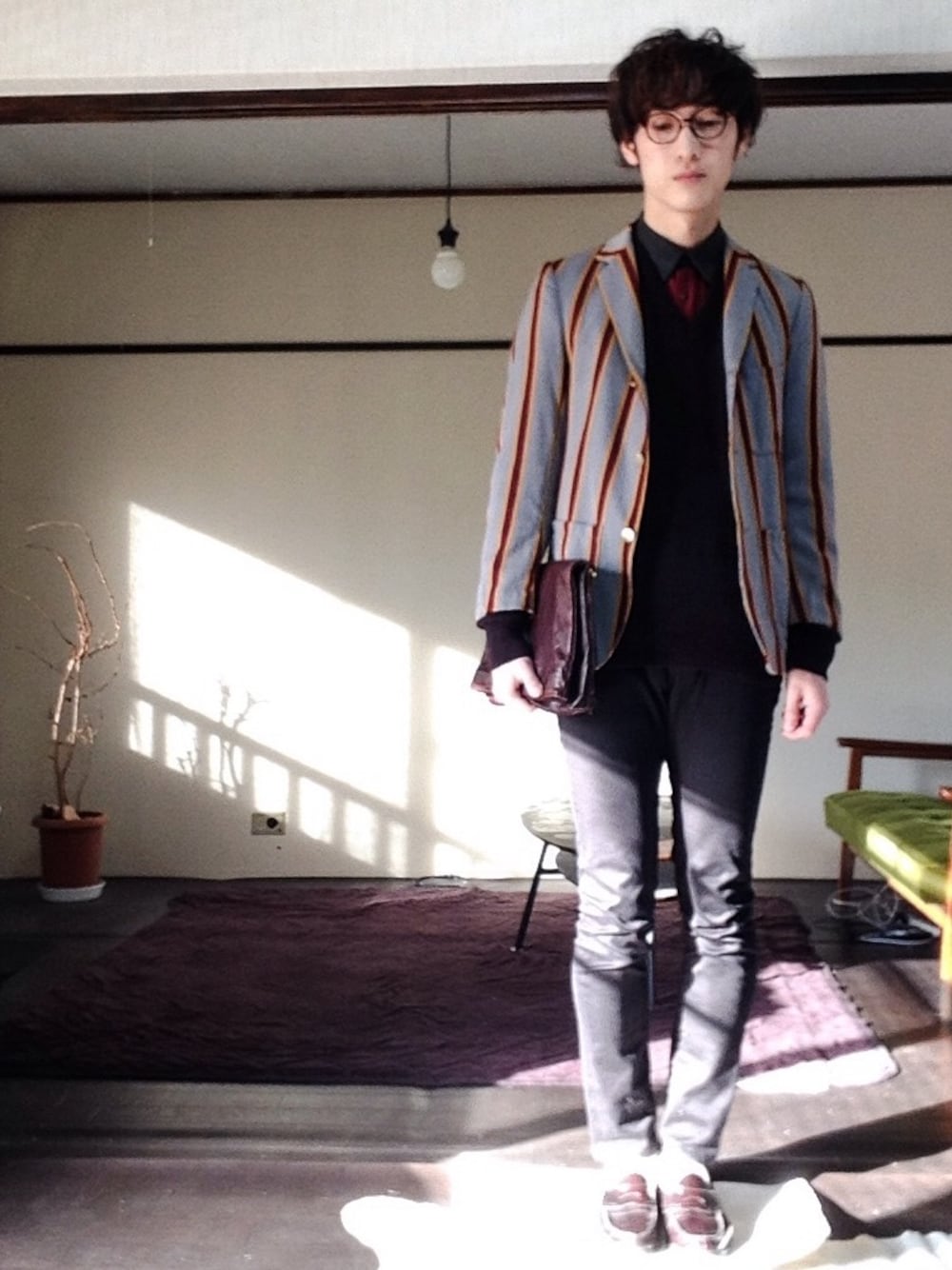 にんにちは。 昨日のからし色タグは、色々なアイテムがあったのですが夜遅くなってしまったことやなんとなく気 分が乗らず投稿しませんでした(^^; 苦手なアイテムも克服できるように出来るだけ投稿するようにしているのですが、「頑張る」という意識が強くなると「楽しい」が少なくなるかもしれないですね(^^) 今日のタグはトレンチコート。こちらは持っていないので参加できません。 ということで、明日のグレーのテーラードにします。 今回は古着屋で購入したストライプの入ったテーラードです。 3つボタンで今はあまり見ない形かなと思いますが、なかなか雰囲気を持っています。 上品な佇まいと配色による個性が混ざり合って僕の好みです。 ところで、以前僕がある古着屋さんに行った時にこんなことを言って頂きました。 「〇〇さんはとてもきれいに服を着てらっしゃいます。ただ、直線ばかりのようです。曲線のアイテムを混ぜてあげるともっと柔らかい雰囲気が出ると思います。」 きっとこれは僕が悩んでいたこと。 でも、自分で悩んでいることは分かっていても表出できなかったこと。 とてもありがたい。 僕は新しいものさしを持って服を選ぶようになりました。 今回は基本ドレス(直線)寄りではあるのですが、そんな中に曲線の要素を混ぜました。 丸いメガネ、(スラックスではなく)スキニー。 フォルムの事ではなく、そのアイテムの持つ雰囲気は曲線に近い。 直線ベースには曲線を。 曲線ベースには直線を。 到達点は自分のところ。