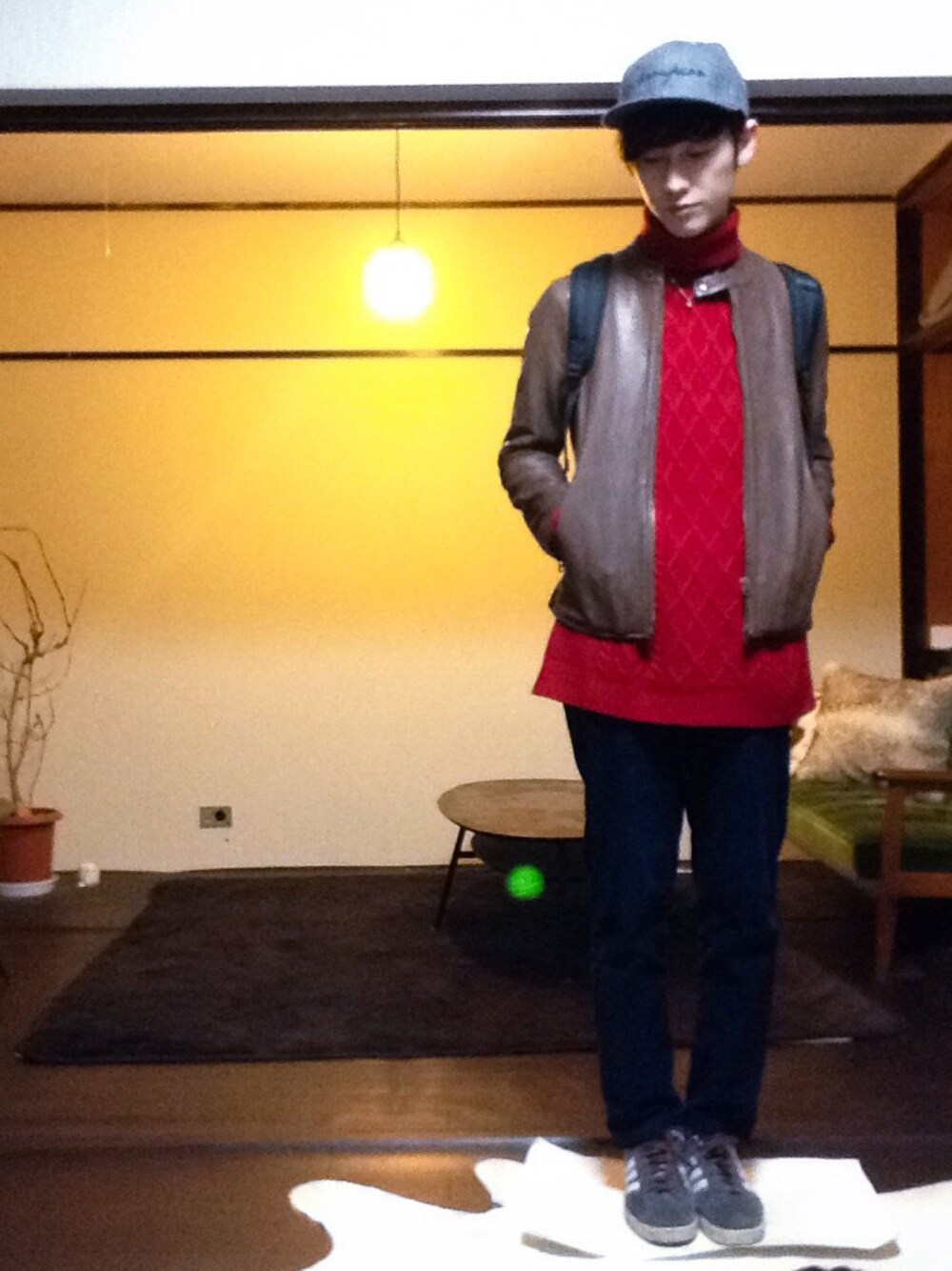 こんばんは。 今日のタグは赤ニットということで、GUのタートルネックニットを使ってみました。 久しぶりにベースボールキャップを被りたかったので、そこから考えました。 このニットはXLサイズなのでかなり丈が長めです。 パンツはスッキリさせたいなと思いましたが黒スキニーからは少しずらしたくて、少しテーパード気味のイージーパンツで野暮ったい感じにしました。 赤の膨張を抑えようと赤系ブラウンのレザージャケットで包みました。 ベースボールキャップはあまり慣れないので、スニーカーと色を合わせて安心感を得ました。 慣れない時は、どこかと調和を。 今日僕は人生で初めてすね毛を剃りました。 この後新年会で女装するからです。 ツルツルです。