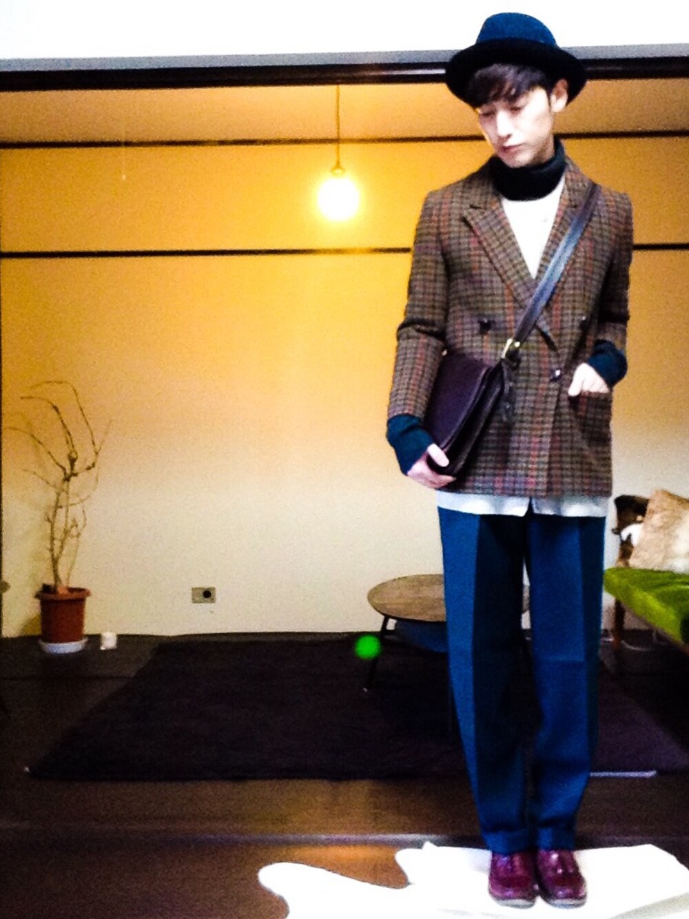 昨日は柿の種への反響が大きすぎて、柿の種タグだったんじゃないかと思う程でした。 みんな好きなんですね笑 今日のタグは革靴ということなのですが、ほとんど革靴履いてますからあまり気にせずいきます。 久しぶりにグリーンのワイドスラックスを履いてみました。 好き嫌いに関わらずこんな色のワイドスラックスを履いている人はそんなに多くないと思うのですが、僕は結構強めの色のワイドスラックスが好きです。 最近は男性でもスカート上手く使っている方がいらっしゃるので凄いなぁと感心するのですが、やっぱり「スカートは女性のもの」という前提ありきですね。 僕はスカートって凄いと思ってます。特にロングのもの。 一続きの服で、コートでないのにあれだけの面積を表現できるのは凄いと思うのです。 最近はロング丈のトップスが多くなり面積の問題は解決されつつありますが、やはりトップスとボトムスの違いは依然残ります。 だからでしょうか、色、柄物のワイドパンツに凄く惹かれます。 「雰囲気持ってってくれ!」と願いを込めます。 今回はパンツとシューズを先に決めました。 グリーンと赤系ブラウン。面積も含めればこれだけでも色味としては十分です。 次に無彩色のチャコールグレーのニットを被せ、さらにホワイトベージュの丸首ベストをレイヤードしました。 バランス的にはこれで終わりたいくらいでしたが、寒いので上着を選びます。 ここは色のあるものと無いものどちらにするかですが、敢えて色のあるジャケットを。 ブラウンベースで基本相性はいいと思うのですが、グリーンや赤などで柄が入っているのでさらに溶け込んでくれるかなと。 最後に主張はしないけど雰囲気のあるレザーバッグを持って、横に広がったシルエットを縦に調整してくれるハットを被ってみました。 今回はこんな感じで考えてみました。