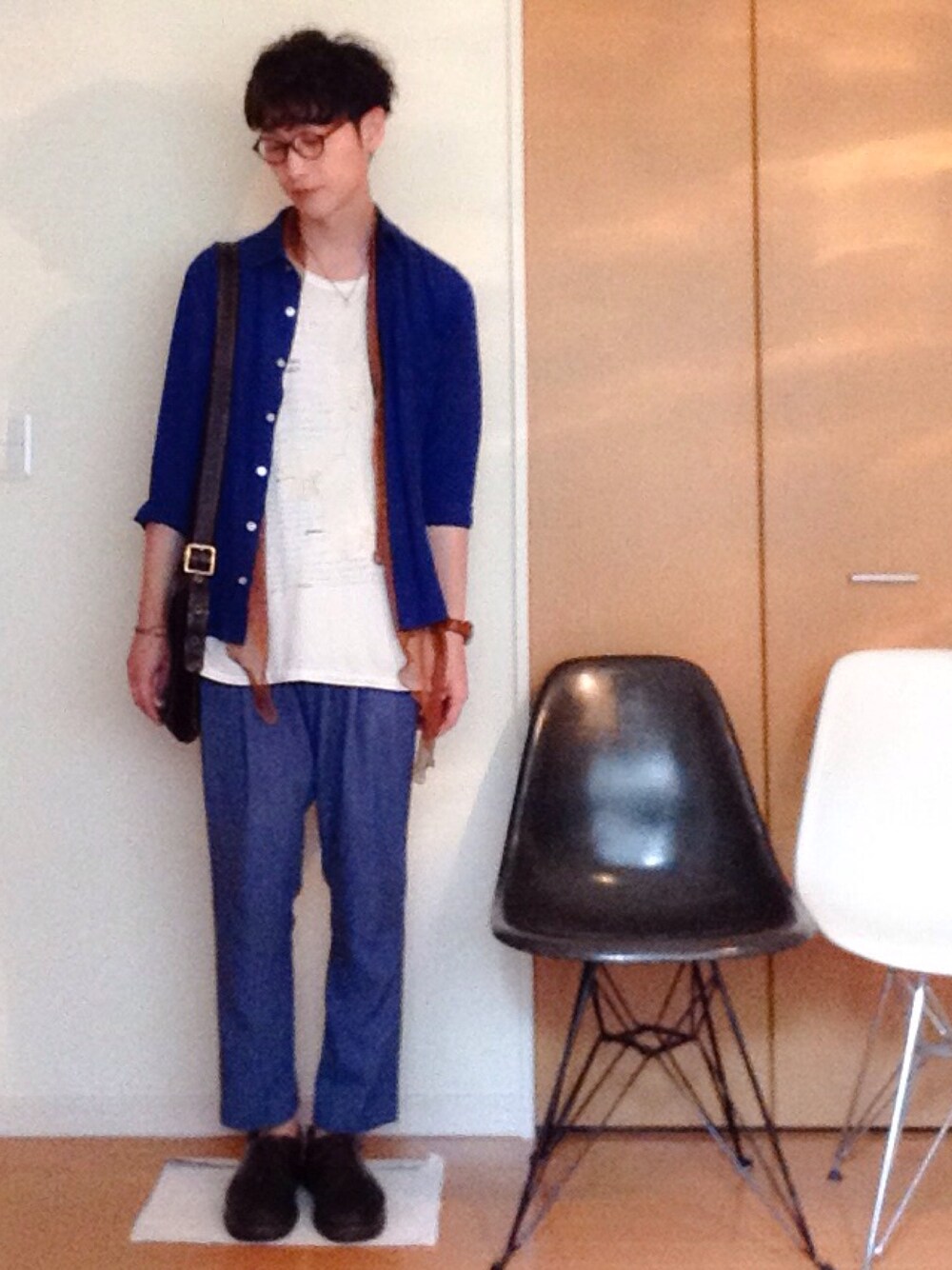 こんにちは。 今日は久々のキレイめです。 Tシャツのプリントが青い文字だったので、ここは青で行こうとシャツとスラックスを選びました。 前々回はブラウン多めの配色にしましたが、今回はブルー多めのブルーxブラウンにしました。 シルエットはいつもより縦長になったので、眼鏡とシューズで丸みを加えました。 少しブラウンを追加したくてスカーフを掛けたら、自分の好きなバランスになりました。 今日は上品なメンバーばかり。 昔で言う舞踏会にあたります。