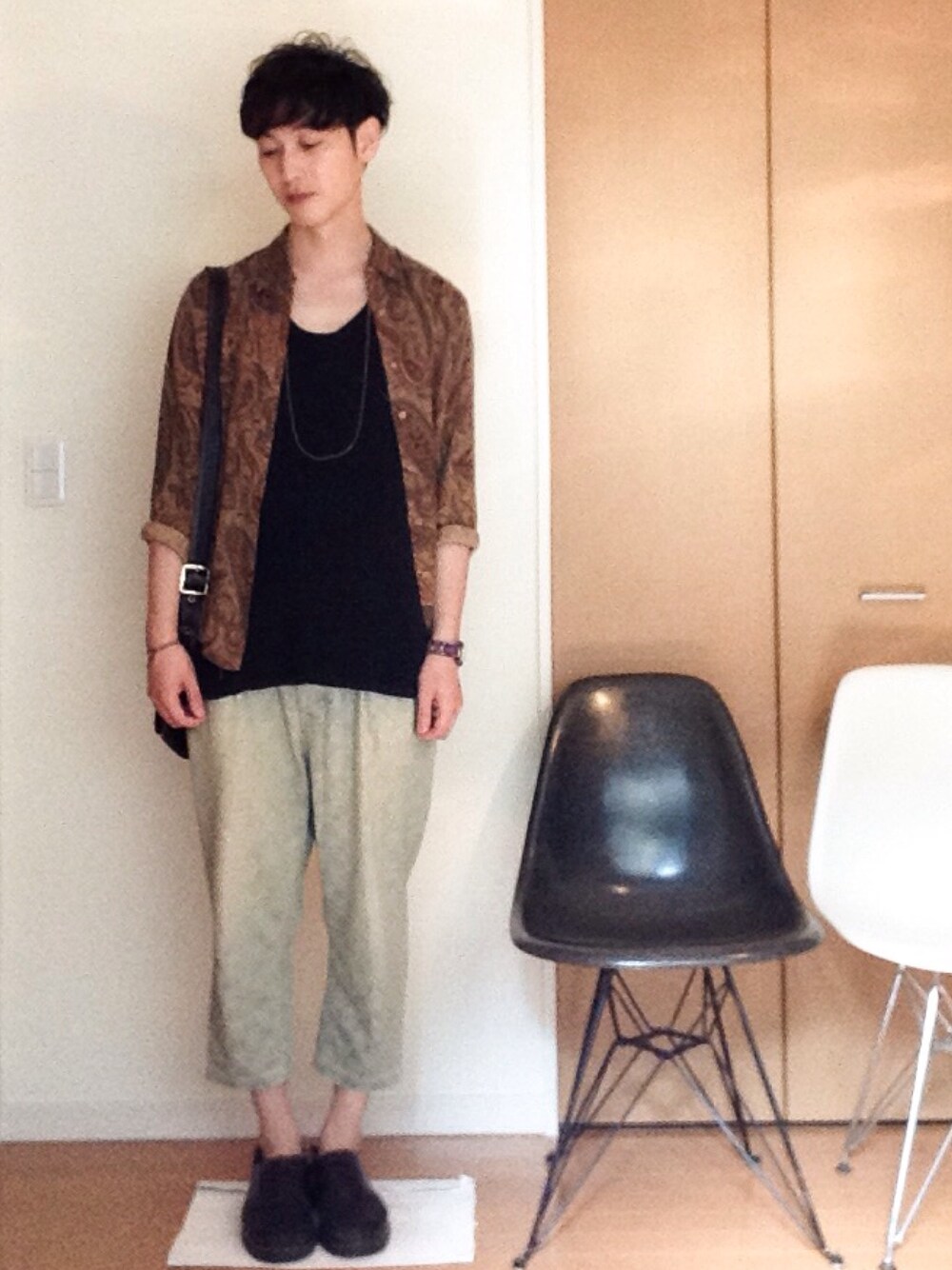こんにちは。 僕は柄物を合わせて着ることがまあまああります。 基本的には敬遠されるものですが、条件を満たすとそれほど抵抗は感じません。 僕なりの条件は ①アイテム同士の雰囲気が近いこと ②好きな配色であること の2点です。 この場合もシャツとパンツはそれぞれ柄物なのですが、緩い雰囲気やアンティークっぽさの漂う柄、そしてブラウン×ブルーの組合せが条件を満たしています。 ブラウンの小物を追加してブラウンをメインカラーに。 ブルーをアソートカラーに。 ブラックで少しだけ内側に引き寄せて。 自分の好きなところに。