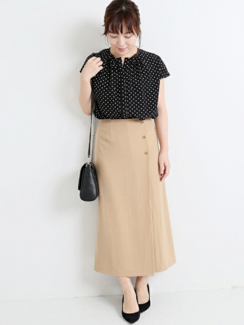 マキシタイトスカート 巻きスカート風の大人スカートは、甘めのドット柄ブラウスとも相性良くオススメ◎ 身長155cmサイズ36着用、足首までのマキシ丈です。