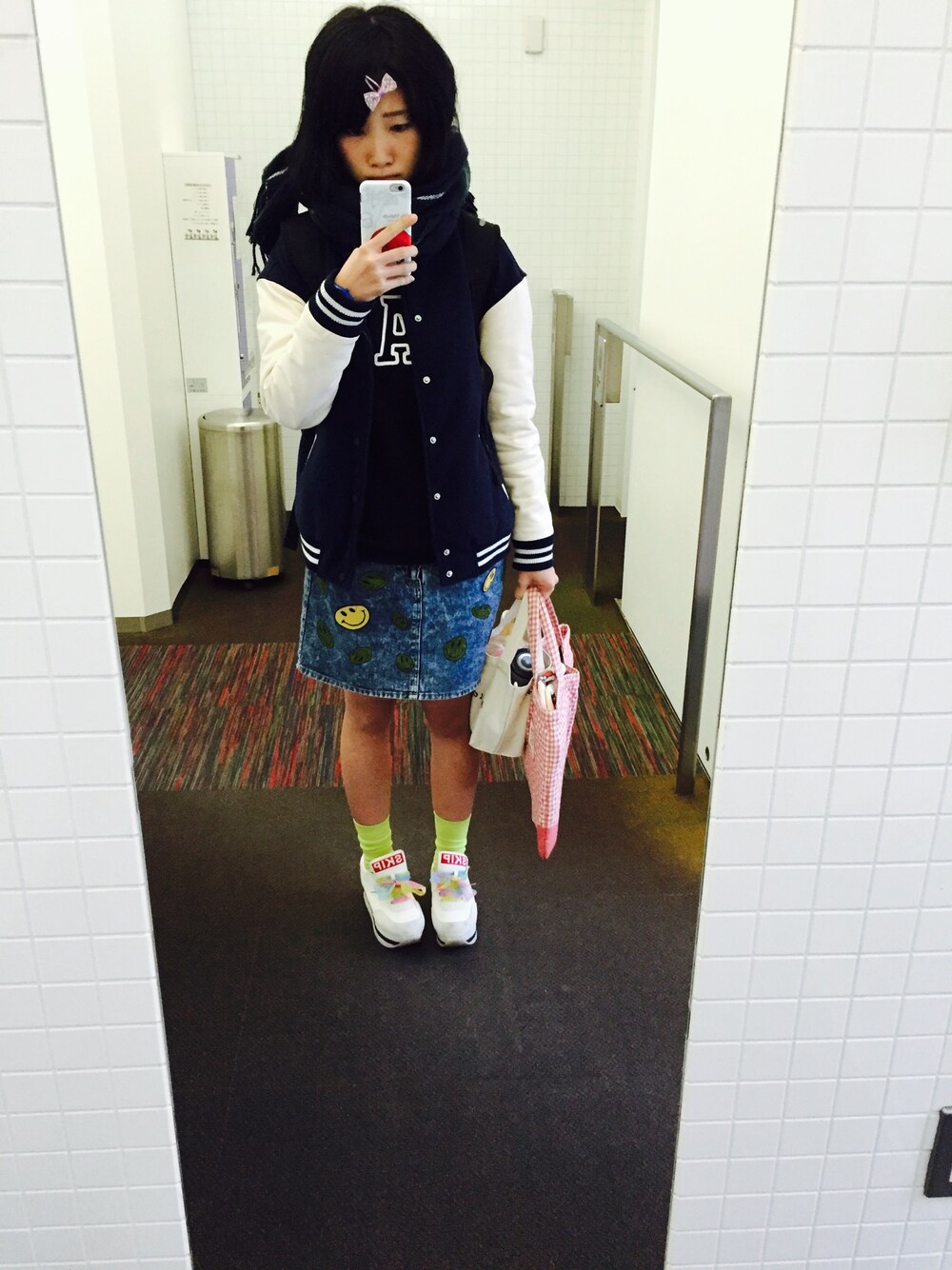 ○△□ 01/20(tue) 就活ヘアーにチェンジ……😩 高校以来の黒髪です😩 今までの服やメイクにズレを感じます……黒髪なだけで😭 トレーナー:GAP スカート:Candy Stripper スタジャン:jouetie スニーカー:wego 時計:adidas 靴下:gu マフラー:ローリーズファーム