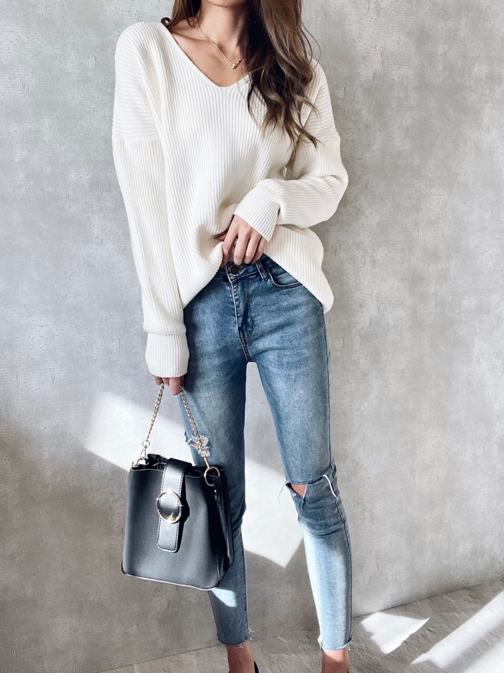 新商品のVネックニットを着用した 大人カジュアルコーデ👠 やっぱりシンプルなコーデは安定デスネ。