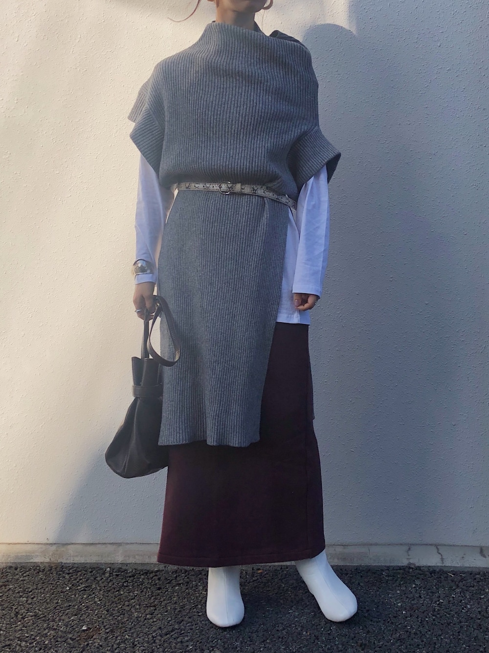 【 ITEMS 】 アシンメトリー変形ニットベスト col;gray knit-02082 サイドスリットロングTシャツ ホワイト tops-02015 日本製裏起毛スウェットマキシ丈スカート col;dark purple siz;M L(着用サイズM) bottoms-04015 パイソン柄 細幅ベルト belt-02030 型押しフェイクレザーバッグ col;brown bag2-02440 チャンキーヒールショートブーツ ホワイト shoes-02043 ー ー ー ー ー ー ー ー ー ー ー ー ー ー ー ー ー ー STAFF HEIGHT 160cm ☑︎Instagram lavishgate_staff