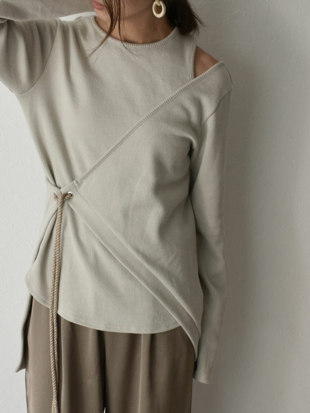 Lavish GateのTシャツ/カットソー「tops-04033 日本製 ロープデザイン アシンメトリー リブ プルオーバーセット グレージュ ピスタチオ キャメル」を使ったコーディネート