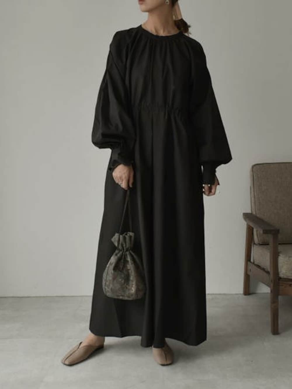 Lavish Gateのワンピース「onepiece-04029 日本製 バックボタン ショルダータックワンピース ブラック」を使ったコーディネート