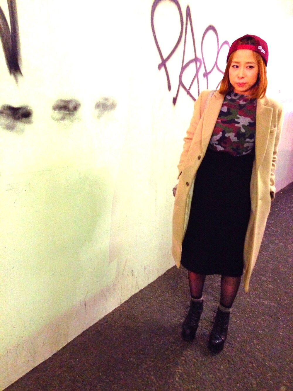 outer : Adam et Rope' tops : TOGA × opening ceremony skirt : TOGA × opening ceremony boots : jeffrey campbell bag : botkier (nano.universe) cap : DOPE by stampd (CANDY) TOGA×opening ceremonyのスウェット** カモフラ柄がお気に入り。