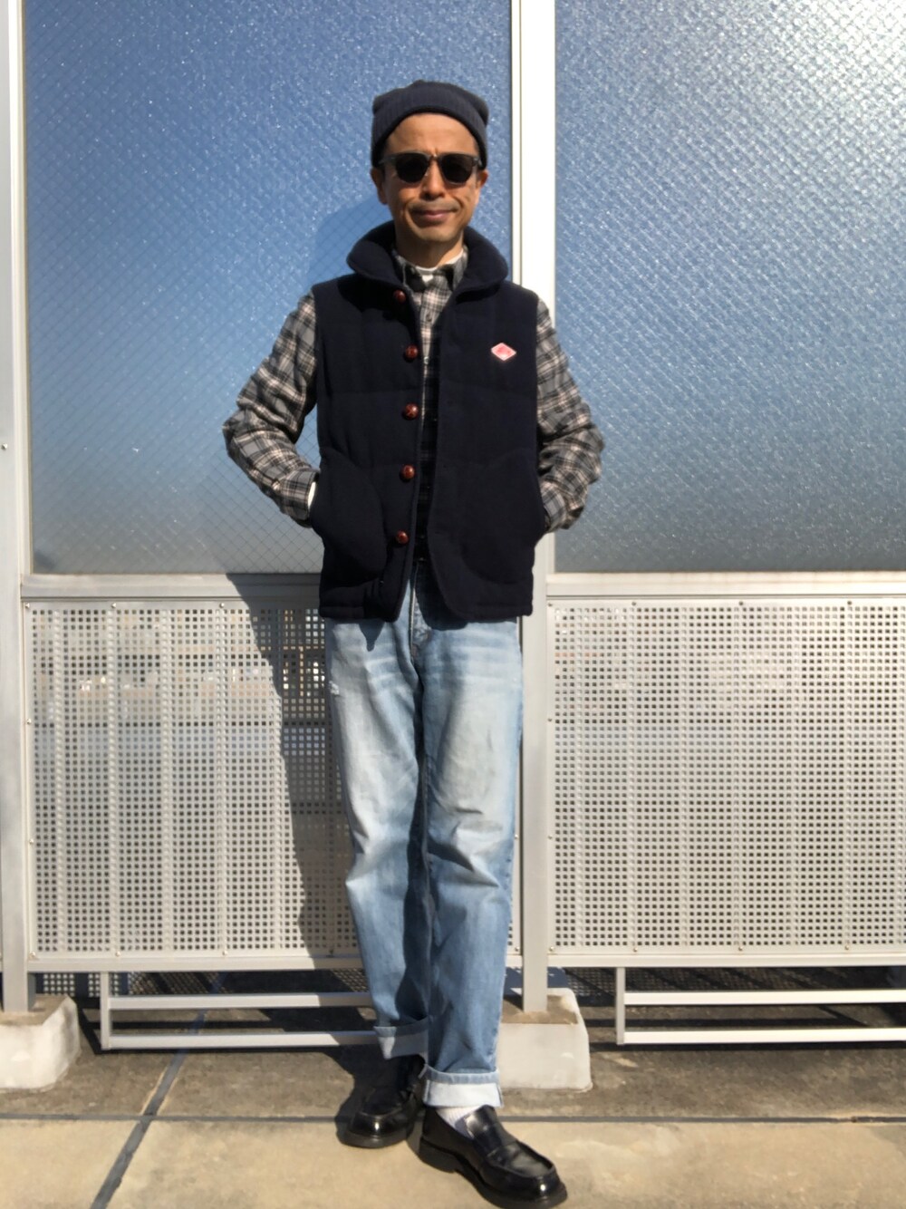 グレーのネルシャツをどう着回すか、からスタートしたコーデです。あまり暗くしたくなかったので、アイスブルーの2インチ大きなデニムを合わせることに落ち着きました。