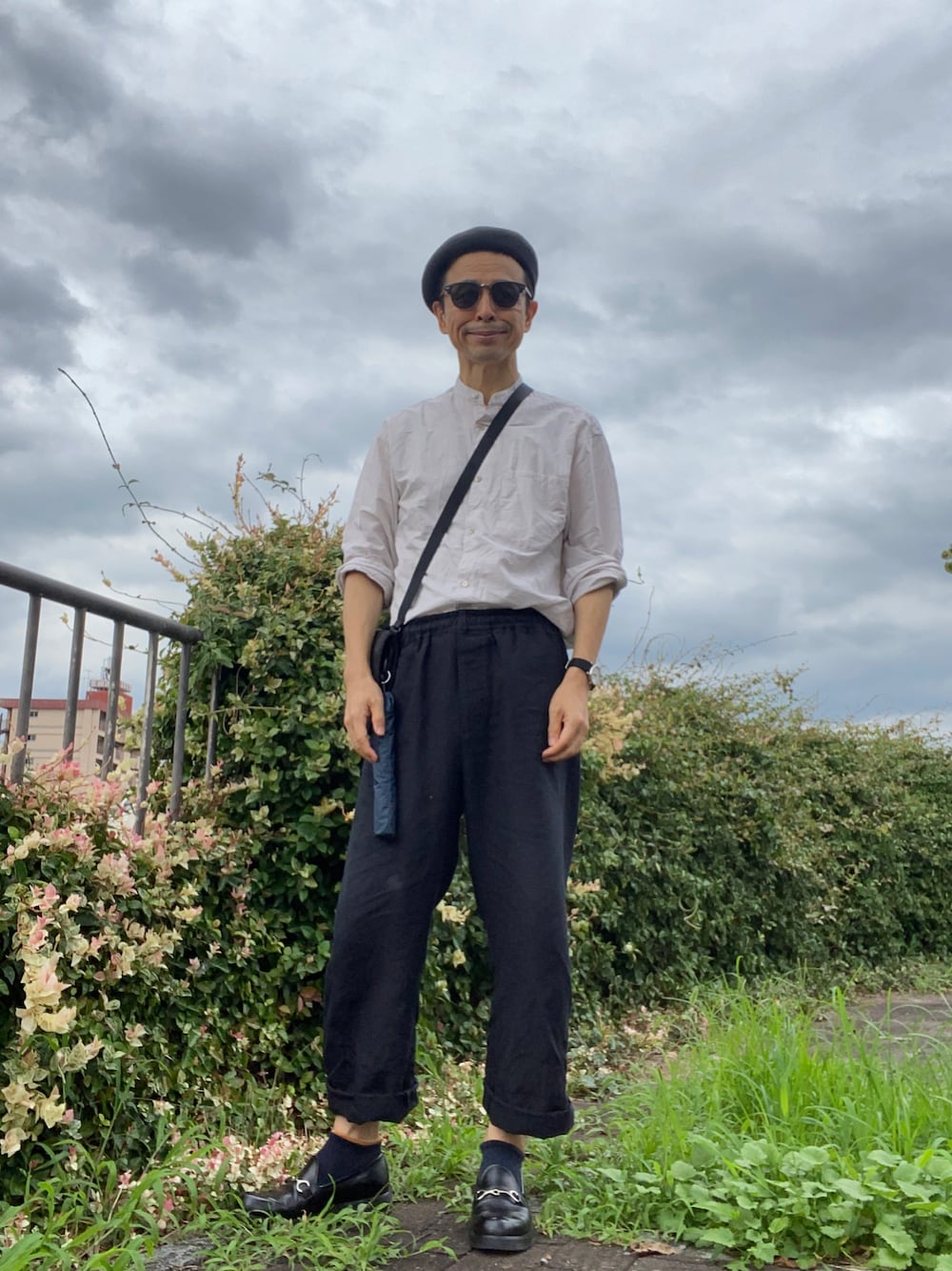 雨が降りそうなので早めのお散歩コーデです。このまま秋になってくれたら嬉しいのですが、そうもいかないんでしょうね。 リネンのワイド・イージーパンツは、やはり通気性がよくて快適です。