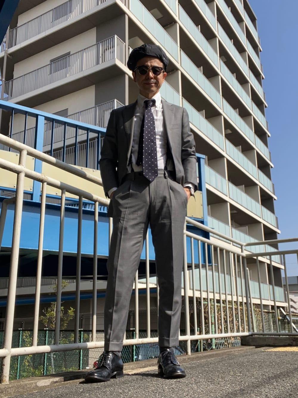 出勤コーデです。秋冬物のセットアップですが、今ぐらいの季節なら問題なく着られます。コーデのポイントはチラ見えしてるサスペンダーでしょうか。