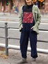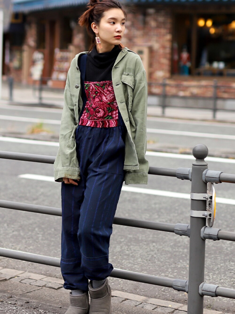 色鮮やかな刺繍が引き立つサロペット* これからの季節は、タートルネックのインナーにミリタリージャケットで可愛さとカジュアルさをプラス◎ 足元はムートンブーツでボリュームを出すのがかわいいですよ〜♪