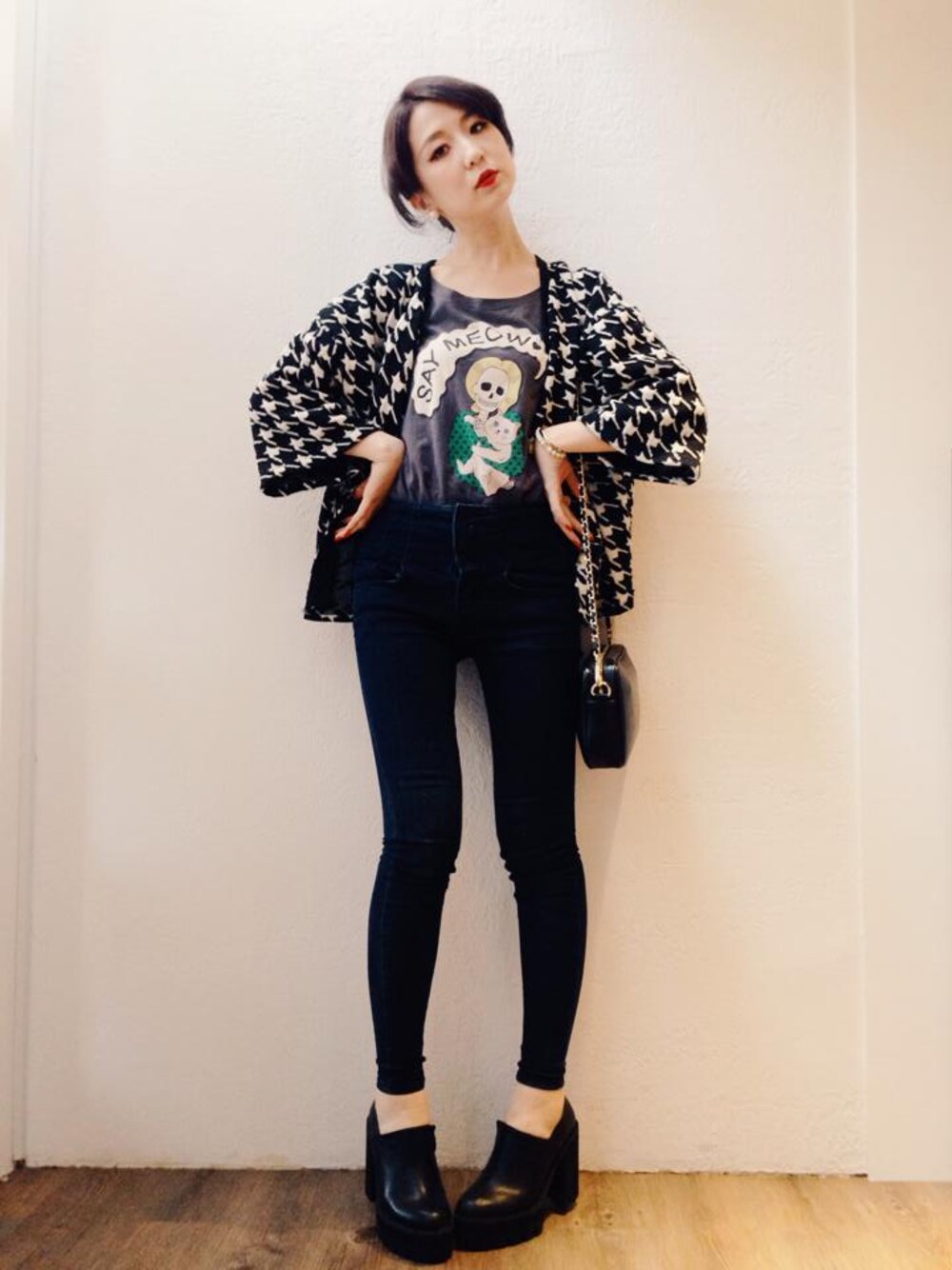 Classical but Sassy outfit Chain bag 、 houndstooth check coat & red lips Cute pattern tee with high waist jeans make the lady's look more stylish Say Meow Tee: http://goo.gl/NKqTG2