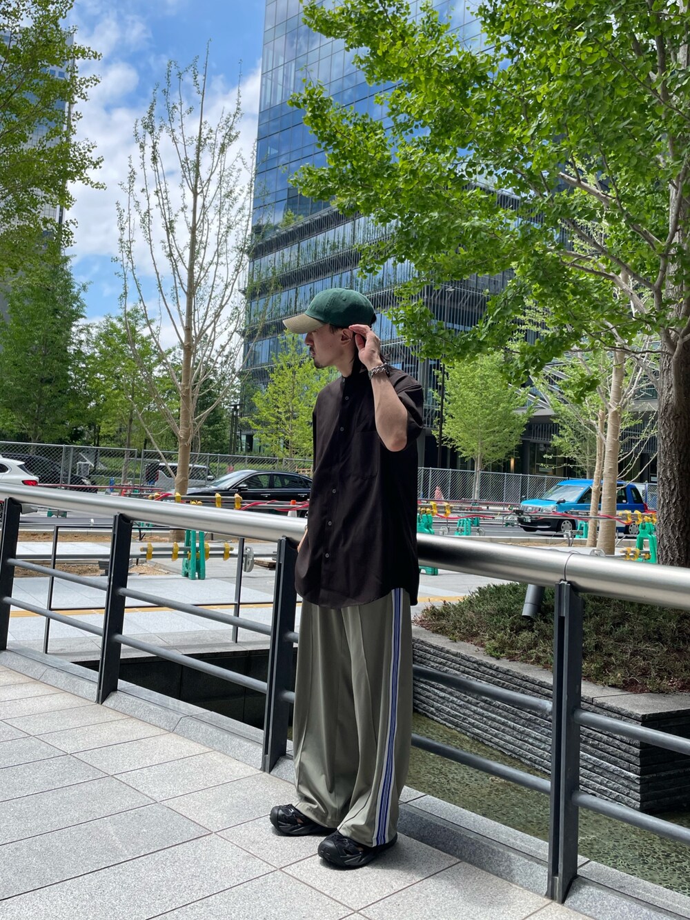 . アースカラーで落ち着きも出しつつ、ラインパンツでカジュアルに