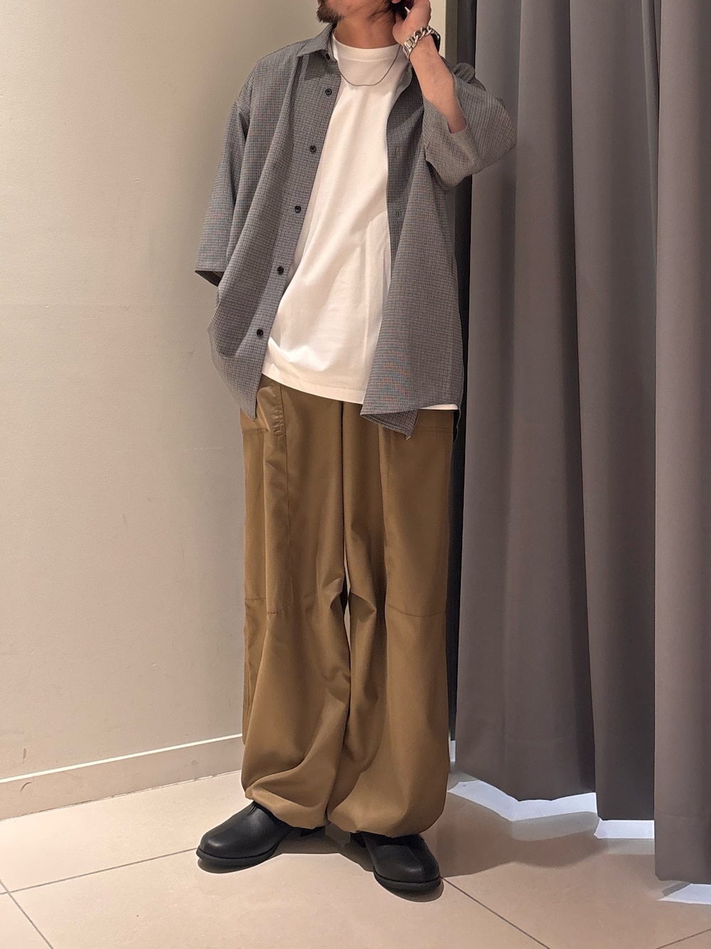 Ryot@(SENSE OF PLACE グランフロント大阪)のシャツ/ブラウス「マイクロチェックエクストラルーズショートスリーブシャツ」を使ったコーディネート