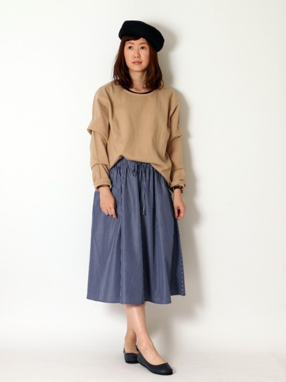 風をはらんでふんわり揺れる、きれいなフレアラインのギャザースカート。 ひざが丁度よく隠れる丈感と、たっぷりギャザーのボリュームが女性らしくまとまるポイントです。 ウエストのゴムシャーリングは、トップスインで見せてもかわいい♪