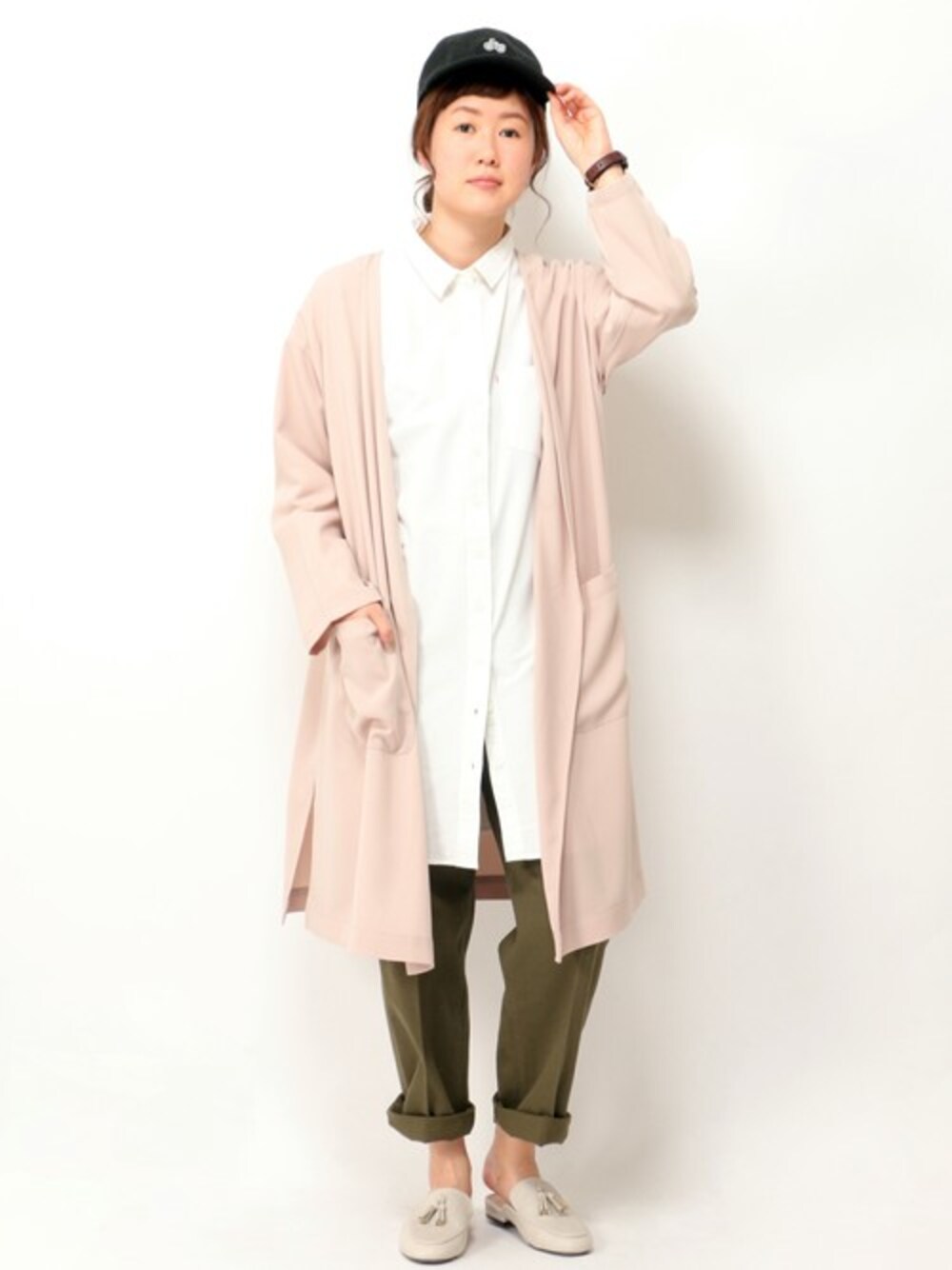 てろんとしたブラウス風の生地を使った、きれい目な雰囲気のカーディガン。 ボタンレスでガウンのように気軽に羽織れて、ライトアウターとして活躍してくれます。 たっぷり長めの着丈ですが、サイドスリット入りで軽快な雰囲気。 手持ちのベルトでウエストマークするアレンジもおすすめです。