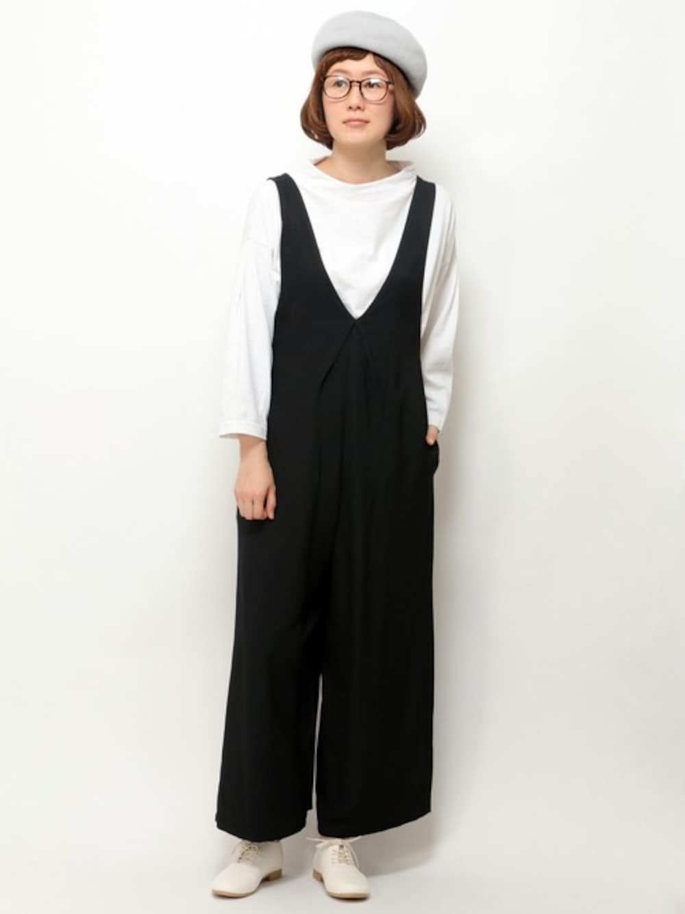 両V開きですっきりと着られるサロペット。 インナー次第で雰囲気を変えられて、着用シーズンも長いアイテムです。 今シーズン人気となっている、袖コントップスなどをインナーに着るのもおすすめ。 素材はフランネルのような起毛タッチで見た目にもあたたかみがあります。
