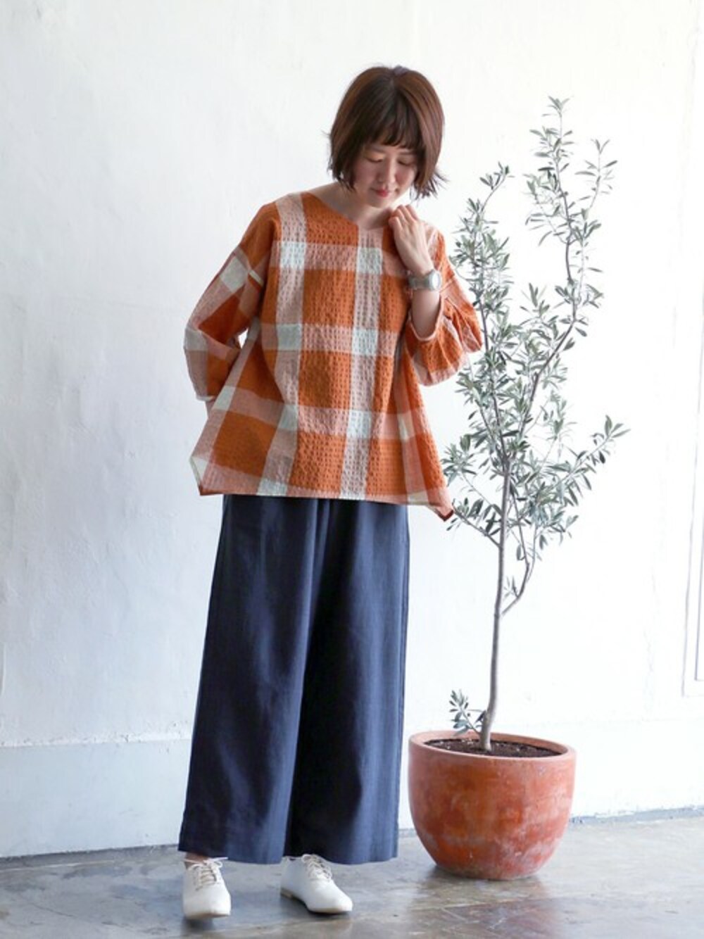 大きなブロックチェック柄のブラウスです。 前はクルーネック、後はVネックで、前後2WAYで着て頂くことができます。 袖はふんわりとした8分袖で、風通しよく涼しく着られるのに、冷房や朝晩の肌寒さから守ってくれる頼もしいデザインです。 夏から初秋まで重宝する1枚です。