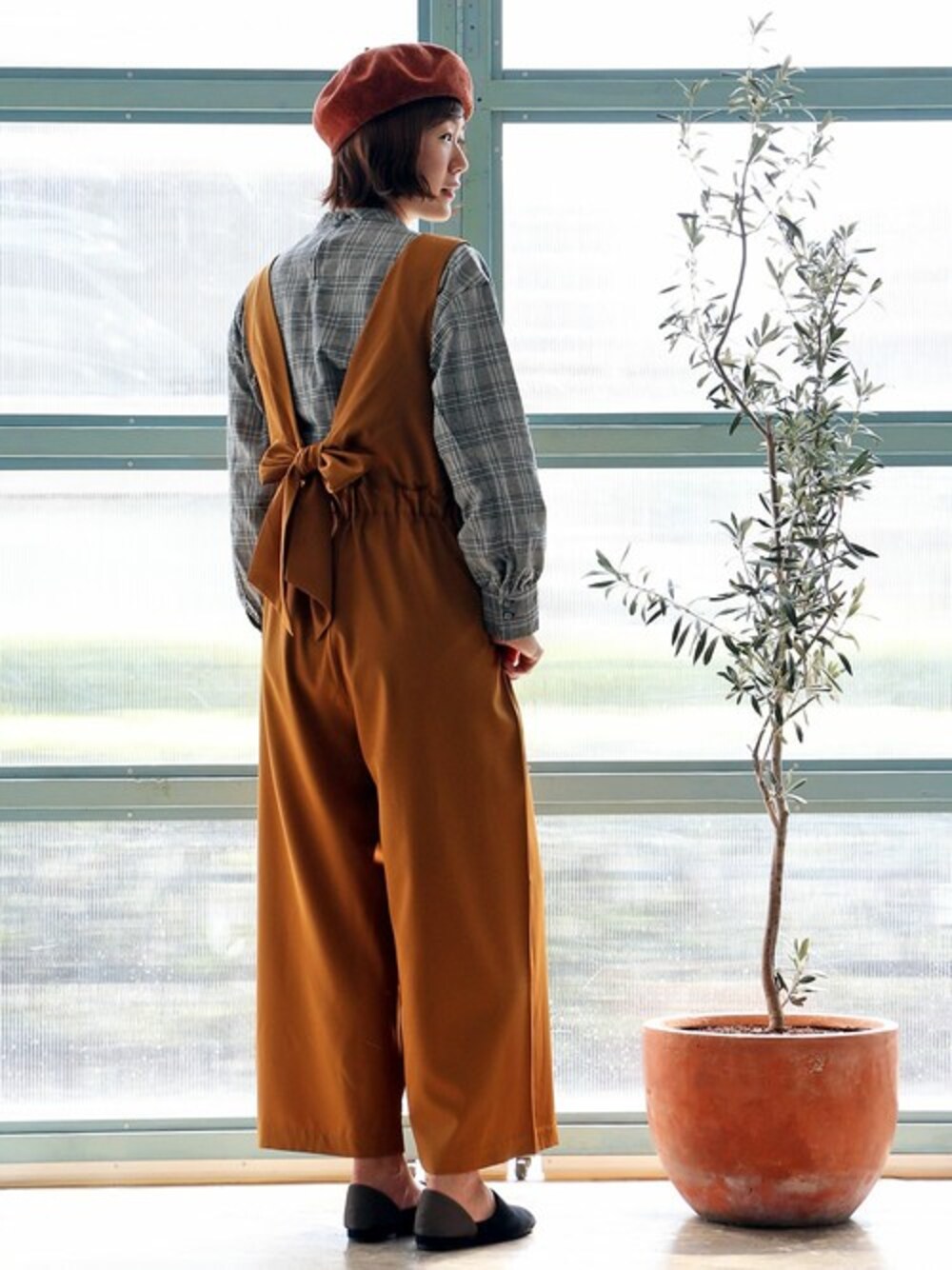 前後どちらもV開きで、すっきりと大人っぽく着こなせるサロペット。 中に着るアイテム次第で調整が効くサロペットは、気温が安定しない端境期にとっても便利です♪ バックスタイルは大き目リボンをワンポイントにして、後ろ姿もぬかりなく。 後ろウエストはゴムに切り替え、ゆったりラクちんな着心地です。