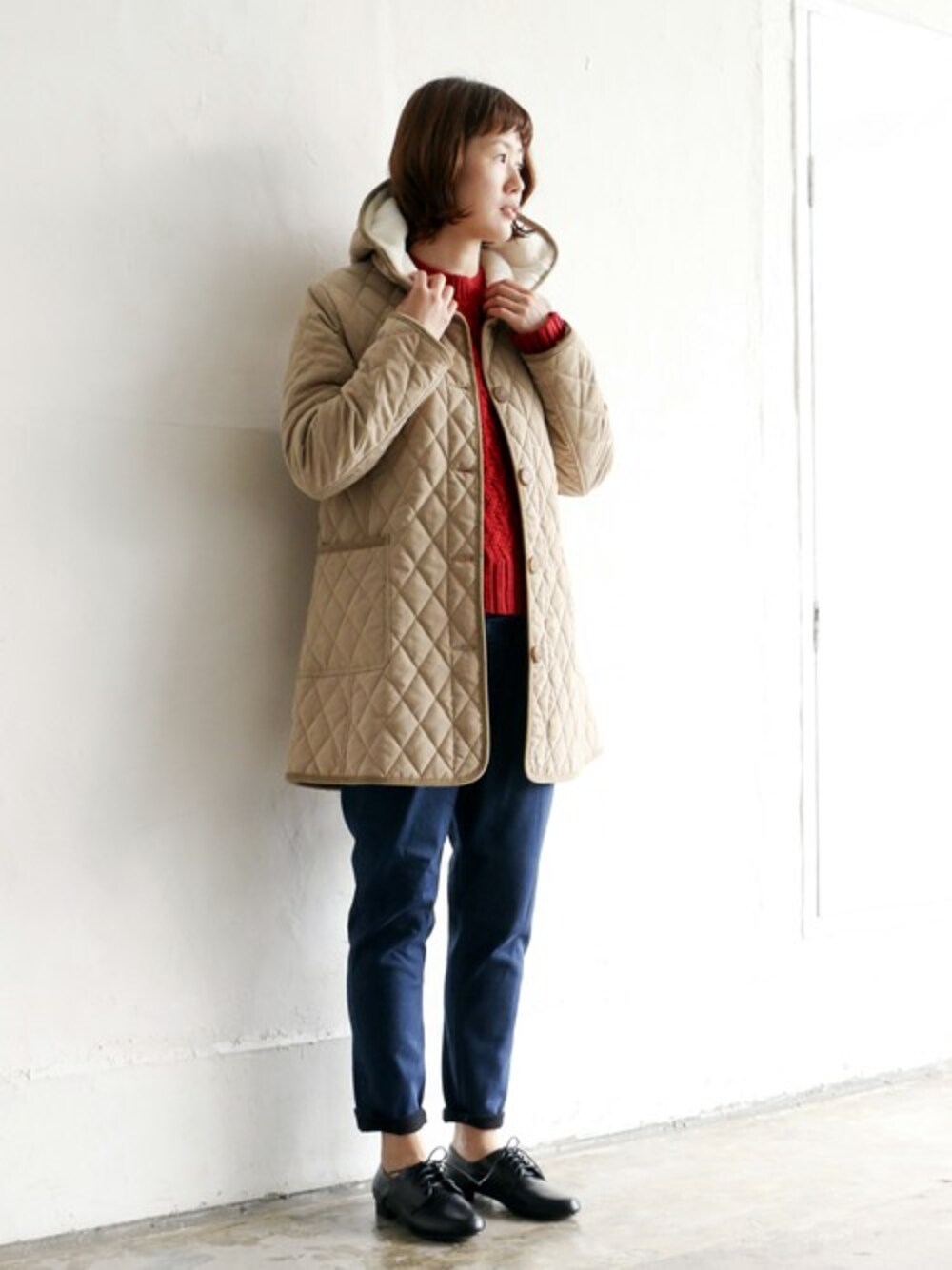 毎年人気のフード裏がボア素材のキルトジャケットです。 今年はトレンドのブラックウォッチ柄もご用意。 軽いので重ね着もOK! 顔まわりのボアがあたたかさを演出してくれます。
