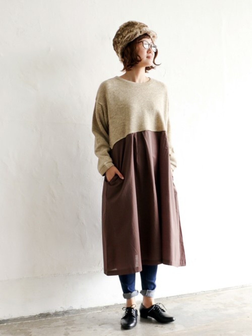 風合いあるメランジ調のニットソーと、コットン生地を合わせたドッキングワンピース。 一枚でコーディネート風になるから、着こなしに迷う時でもこれがあれば安心です。 ゆったりシルエットですが、切り替えの位置を高めに設定してスタイル良く見えるようにしています。 レギンスやデニムを合わせて♪