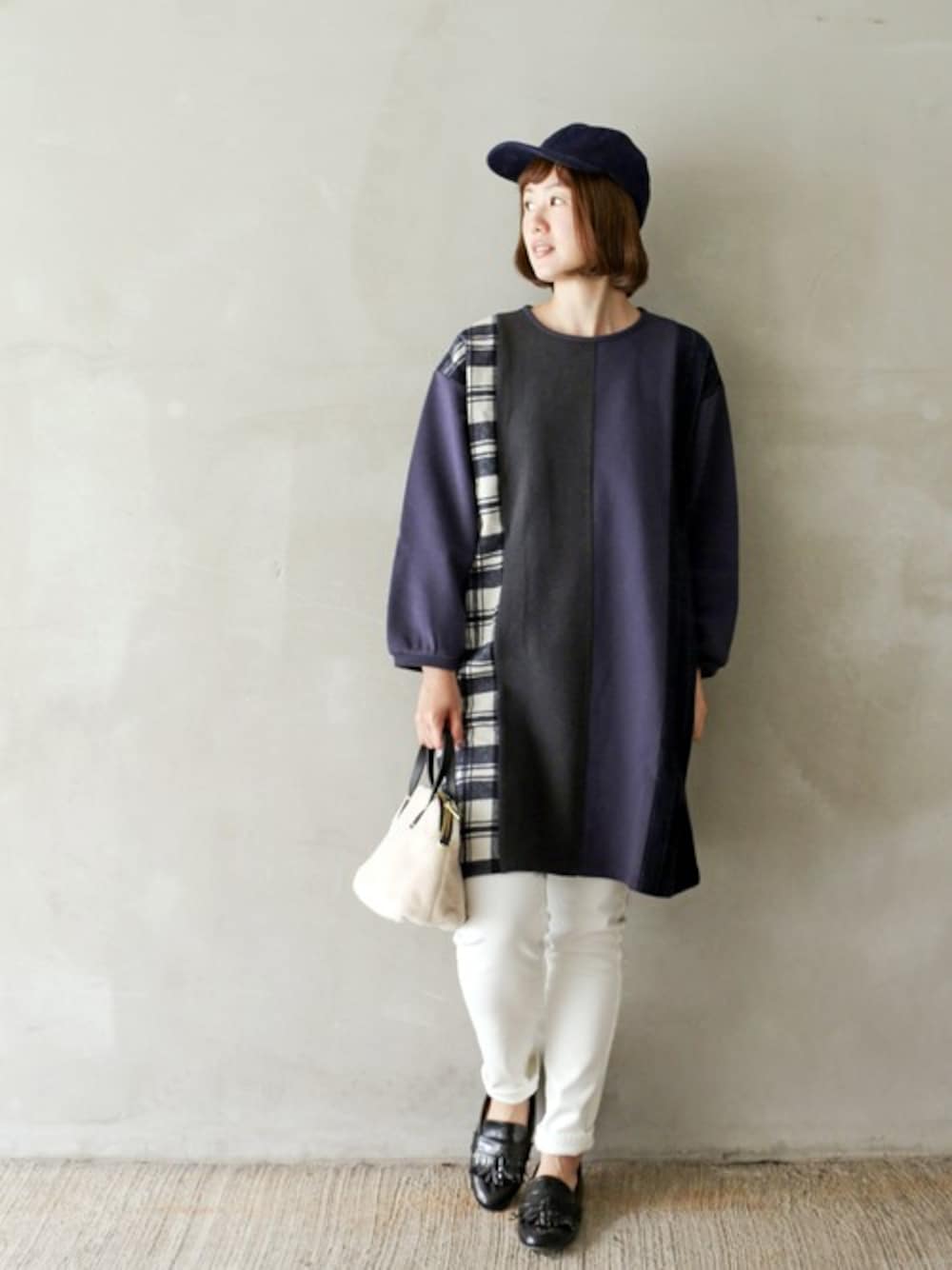 起毛素材のチェックとストライプ、リブニットをパッチワークしたワンピース。 それぞれ同じトーンで揃え、存在感があるけれどもコーディネートしやすくまとまっています。 デニムやレギンス、タイツとレイヤードして着こなすのがおすすめです。
