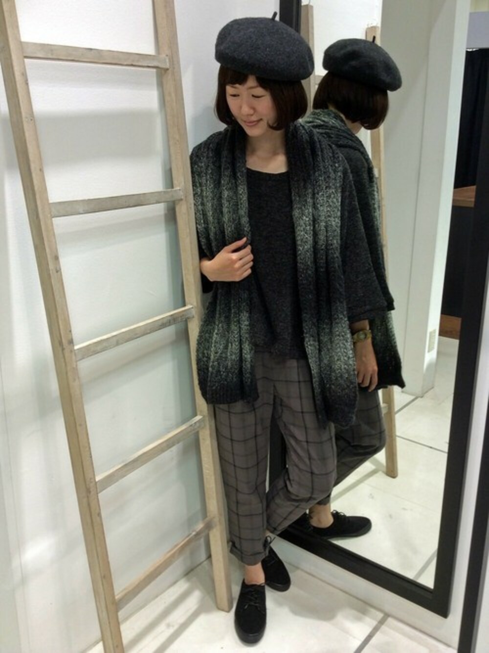 グレーをメインとしたモノトーンコーディネート。 グラデーションのストールやトレンドのチェックパンツでやさしい印象も取り入れています。