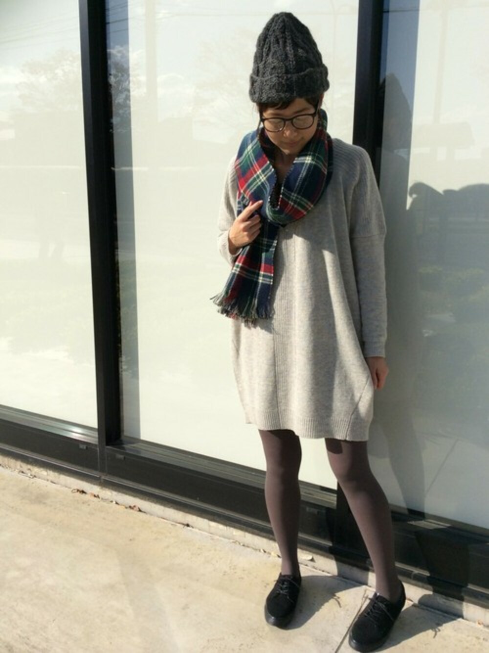 ニットワンピースを主役にしたグレーのワントーンコーディネート。 ニットは変形したオーバーサイズですが、縦に入ったリブ使いでシルエットよく着こなせます。 多色使いのストールをポイント使いにしました。 ストールは裏側が千鳥柄になったリバーシブルタイプで使い勝手バツグンです♪
