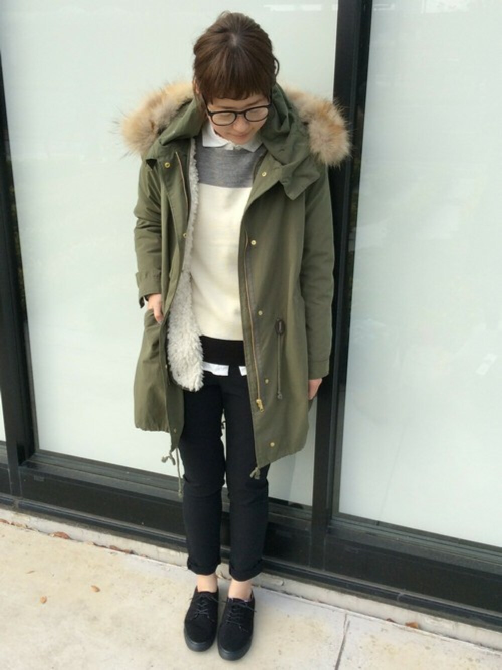 モノトーンきれいめコーディネートにカジュアルなモッズコートを合わせたミックススタイル。 モッズコートは大きめフードが小顔効果あります。 シャツやメガネのきちんと感とコートの対比がポイントです。