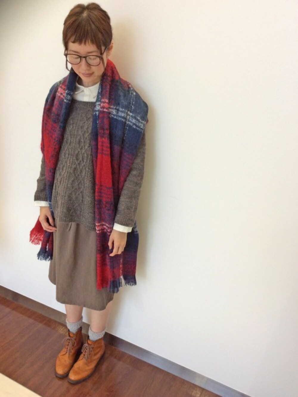 ニットのインに使用したのは、シャツとスカートがドッキングしたワンピース。今大人気のアイテムです♪ ケーブル編みがレトロな雰囲気のニットは首元ゆったりデザインなのでレイヤードスタイルがおすすめです。 大柄チェックのストールは赤をチョイスしクリスマスムードを高めました。