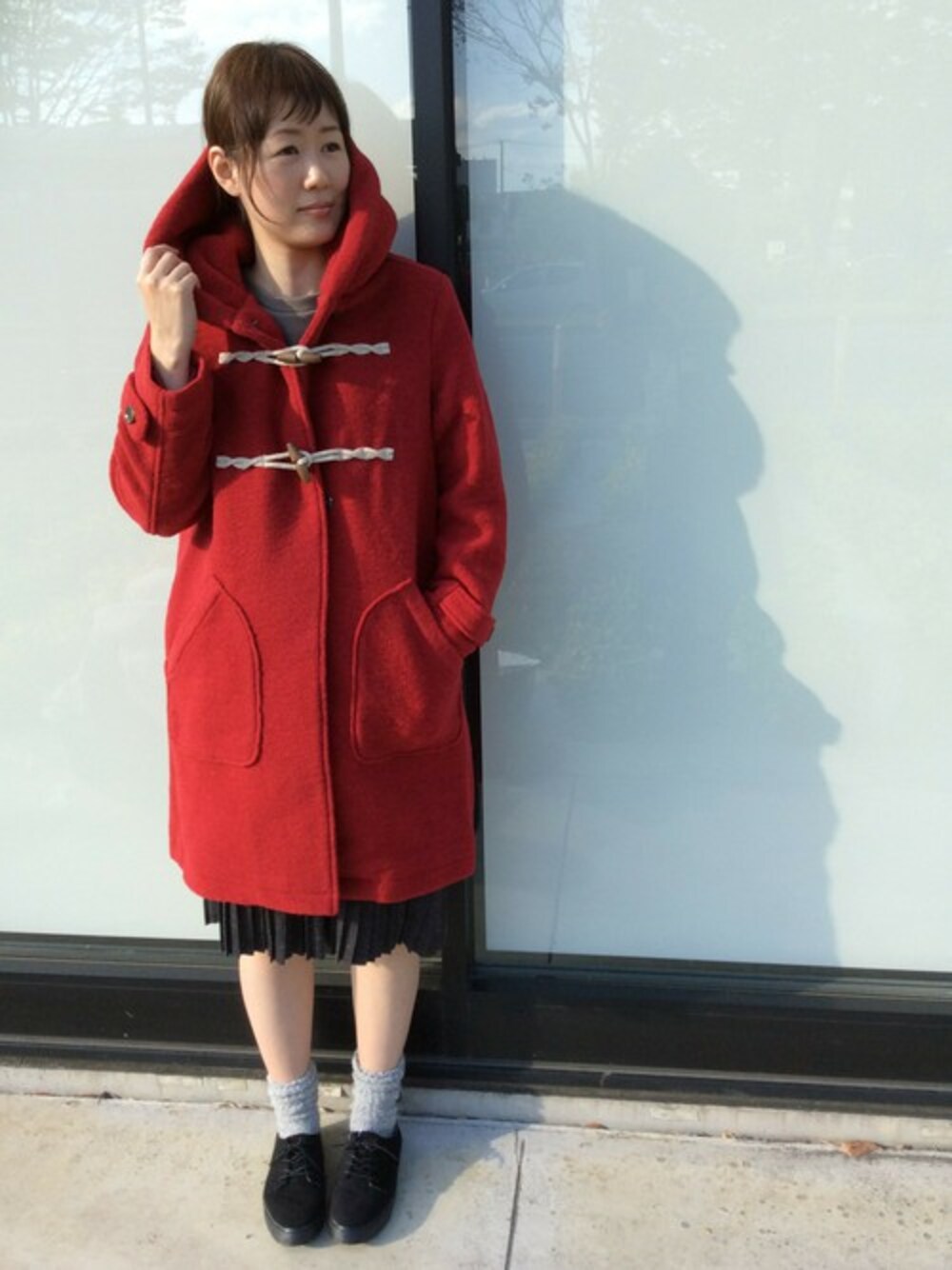 真っ赤なクリスマスカラーのダッフルコートが主役のコーディネート。 スライバーという軽くて暖かい素材を使用することで、ロング丈のノンストレスで着用できます。 人気のミモレ丈プリーツスカートを合わせたトレンドスタイリング。