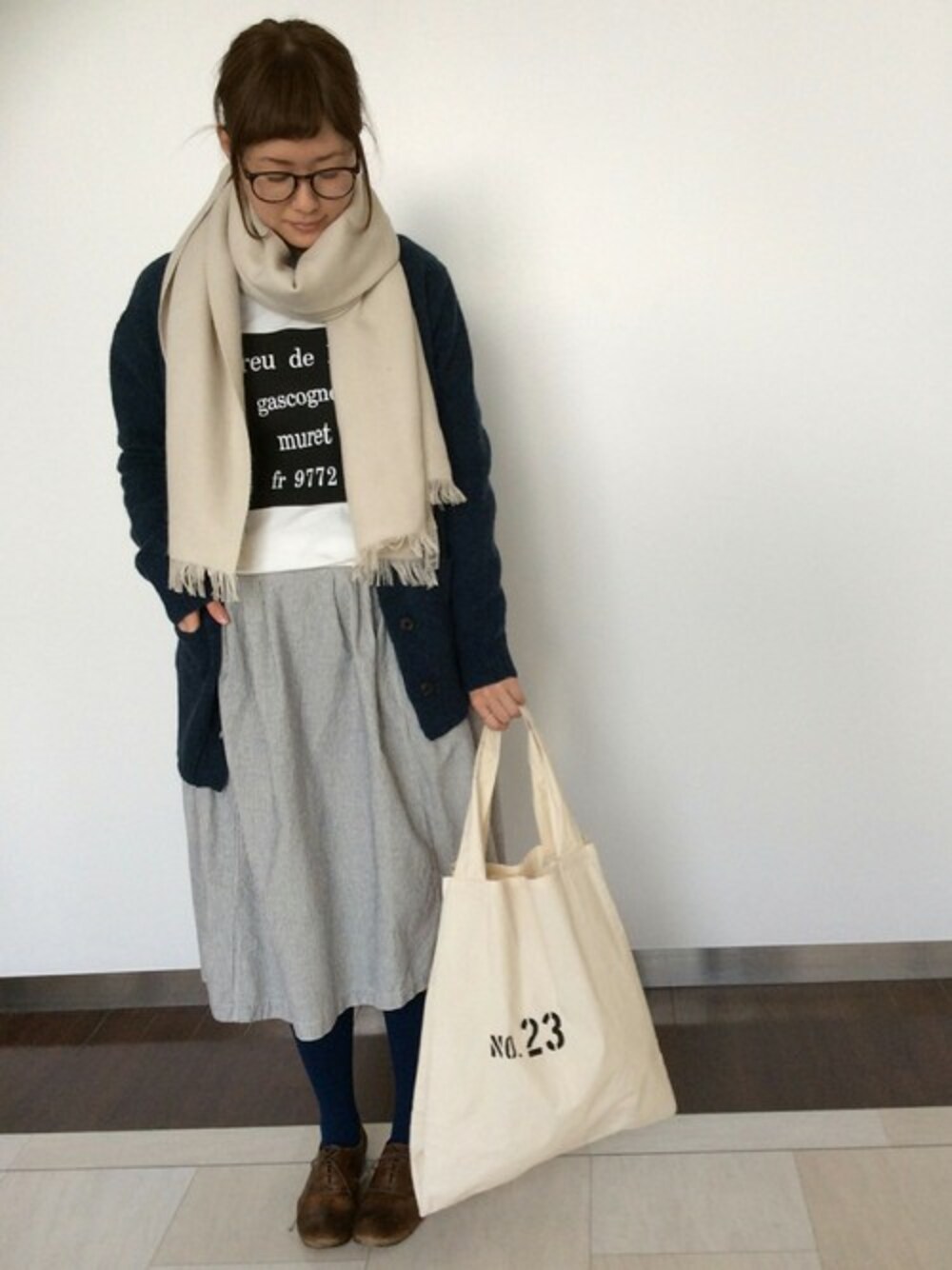 今日はゆったりしたコーディネート。 オーバーサイズのカーディガンはウール100%の温かさ!ざっくり羽織ってください。 カーディガンとタイツの色を合わせてまとまりを出しました。