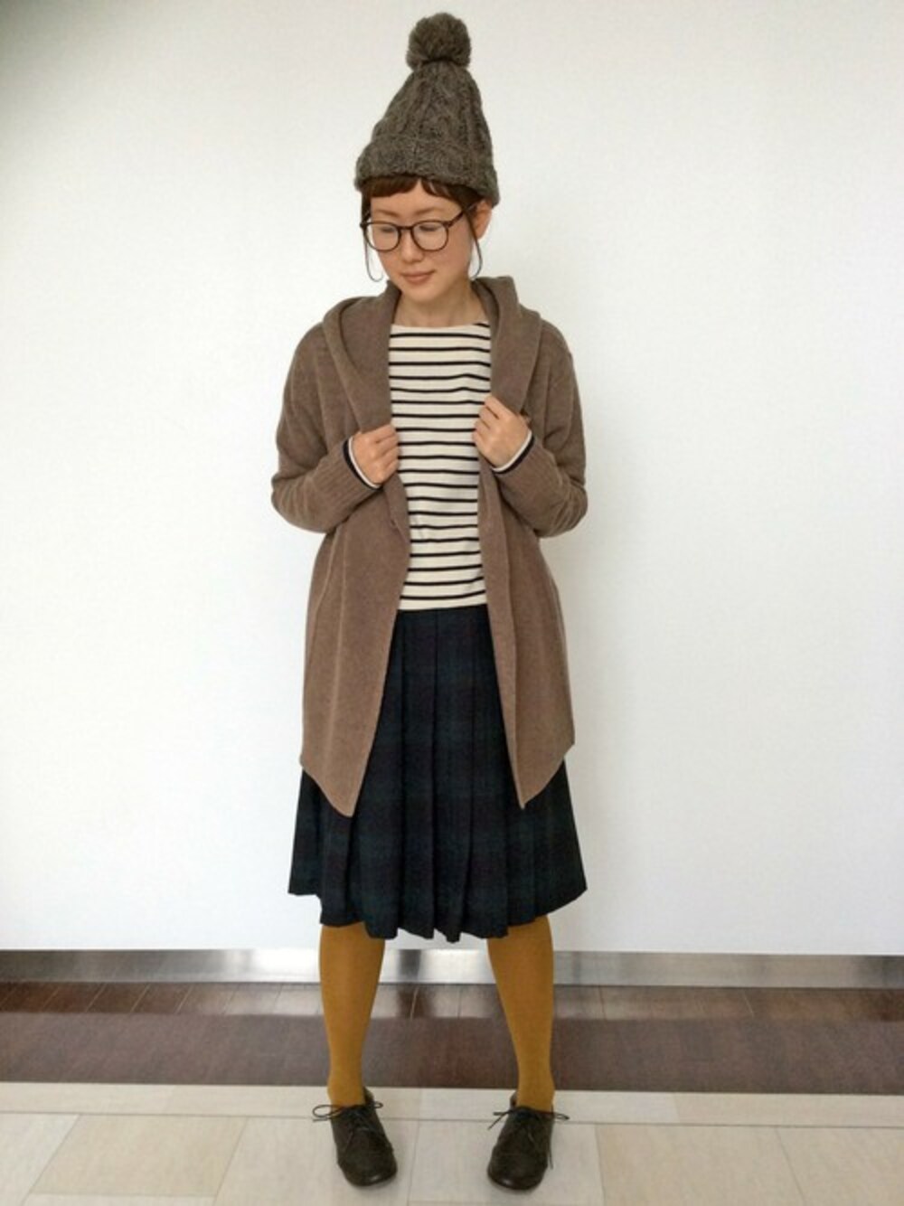 ラップカーディガンという、前仕立てがダブルのカーディガンを羽織りに使用したスタイリング。 お外に出かける時はアウターのインに着ていただけますね。 ブラックウォッチのスカートに細いピッチのボーダーTがお気に入り。 カラシ色のタイツでアウター着ても元気な印象に♪
