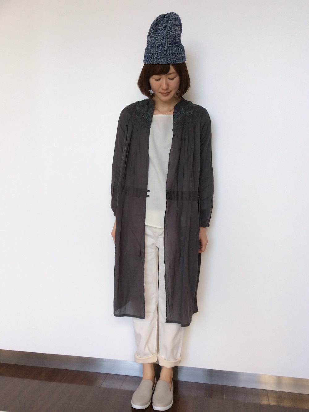 スミクロの大人っぽいコートワンピが主役です! インを全てホワイトにしてIラインを作ることで着痩せ効果がありますよ。 シンプルですが、コートワンピの肩の刺繍が大人っぽくてポイントになります。 ぜひ、アイテム紹介から見てみてくださいね(^^)