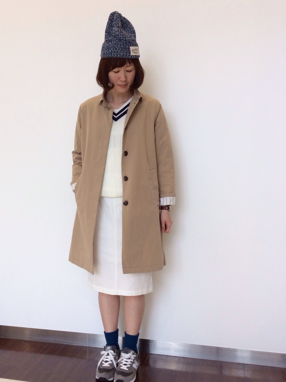 大人っぽいベージュのステンカラーコートを引き立たせるためインはホワイトで統一。 ホワイトでもチラリとチルデンニットを覗かせています。
