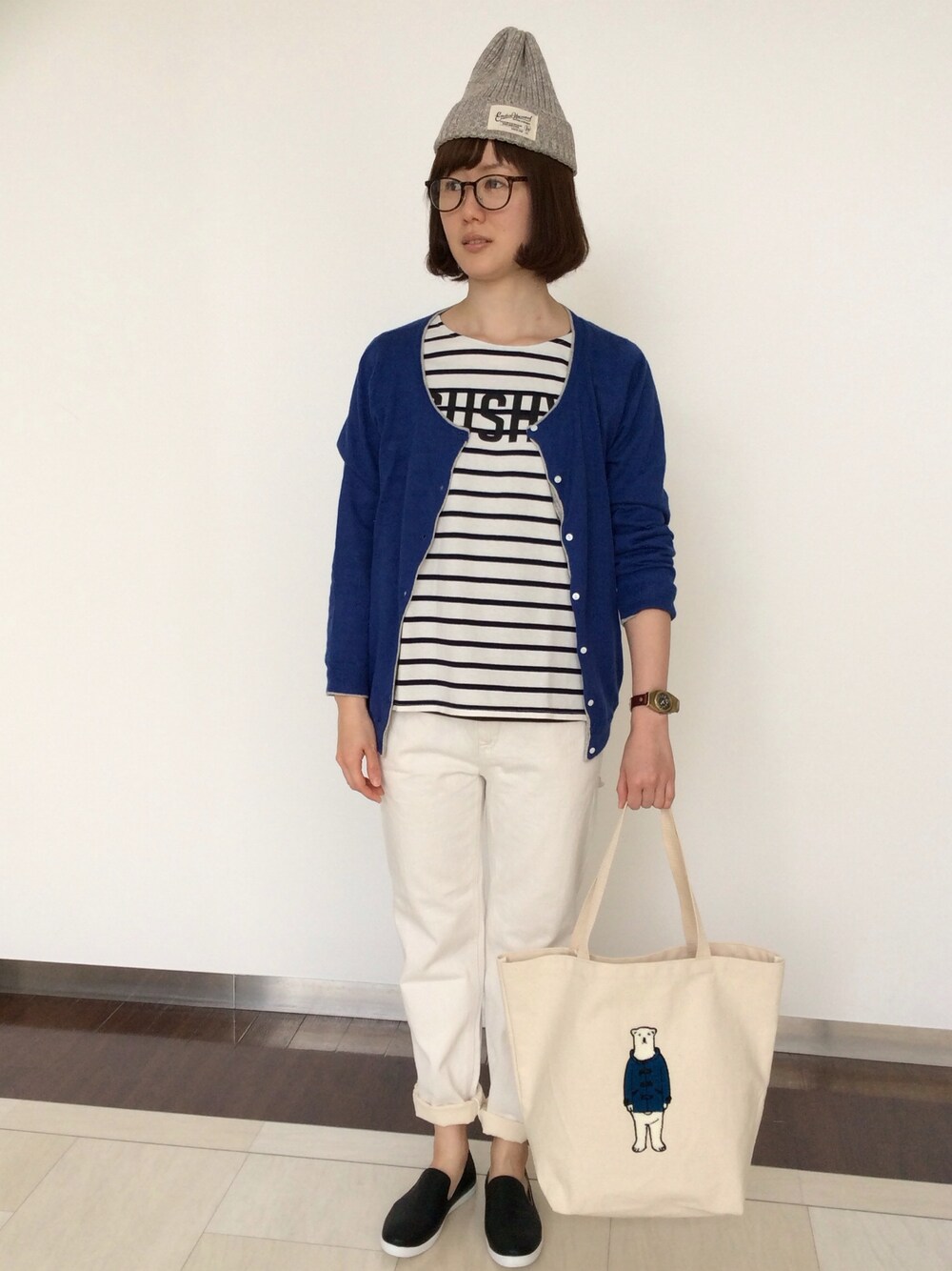 ボーダーとホワイトデニムの定番コーディネートに、今回はブルーをプラスしてより爽やかさを! 小物はダークカラーでまとめました。 くまさんのトートバック、さりげなくお揃いのカラーコーディネートです笑