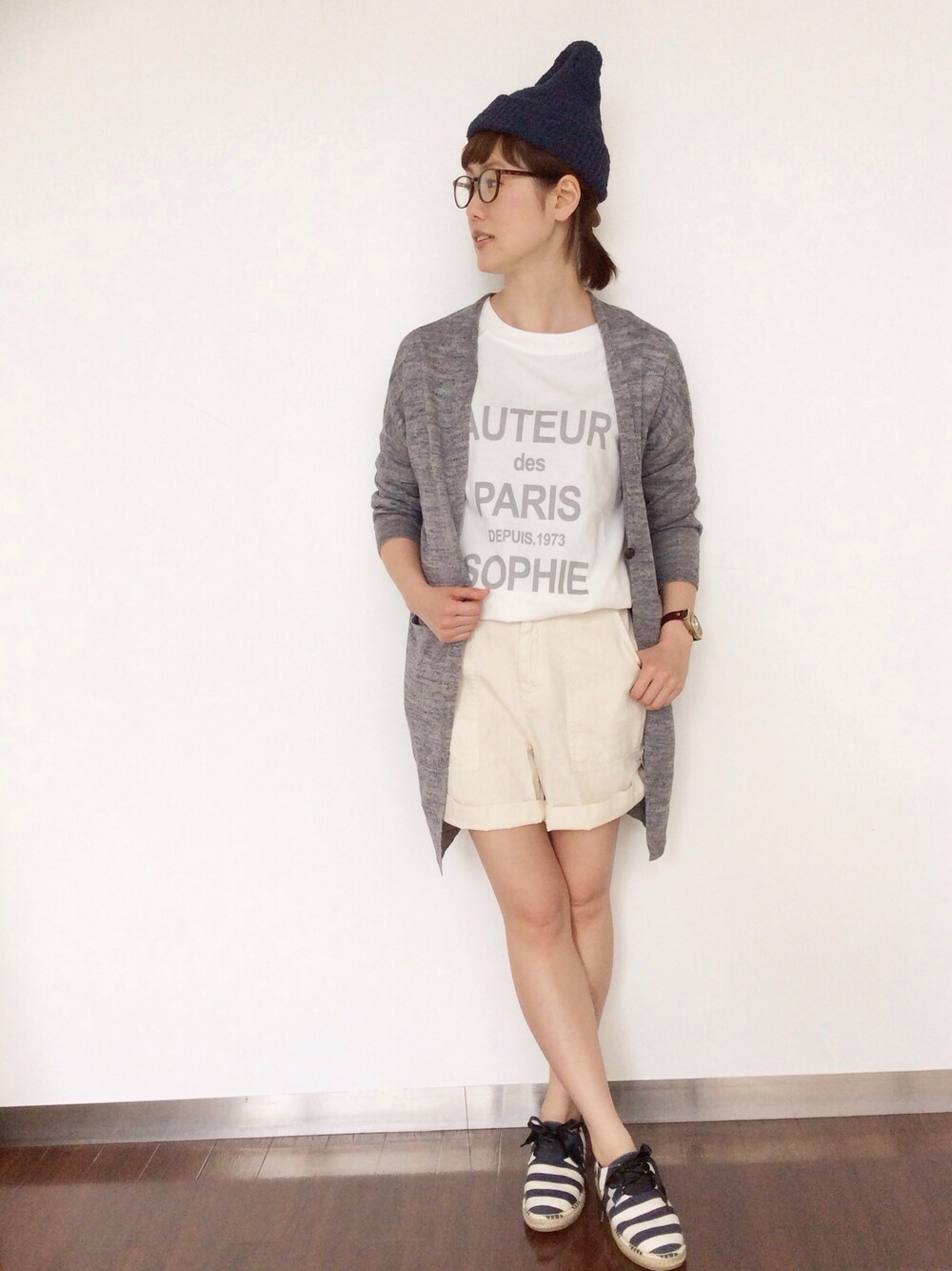 ロングトッパーで縦のIラインのコーディネートです。白いショートパンツはグッと初夏っぽくなりますね。プリントTでカジュアルさも加えて、帽子と靴の服飾小物は同系色にするとまとまりがでます。