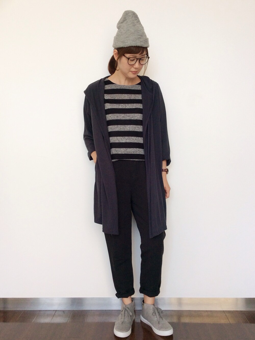 グレー×ブラックのモノトーンコーディネート! 羽織りは若干ネイビーですが(^^;; ボーダーとニットワッチ、スニーカーをグレーに統一しました!羽織りは冷房対策としてもまだまだ使えますね。