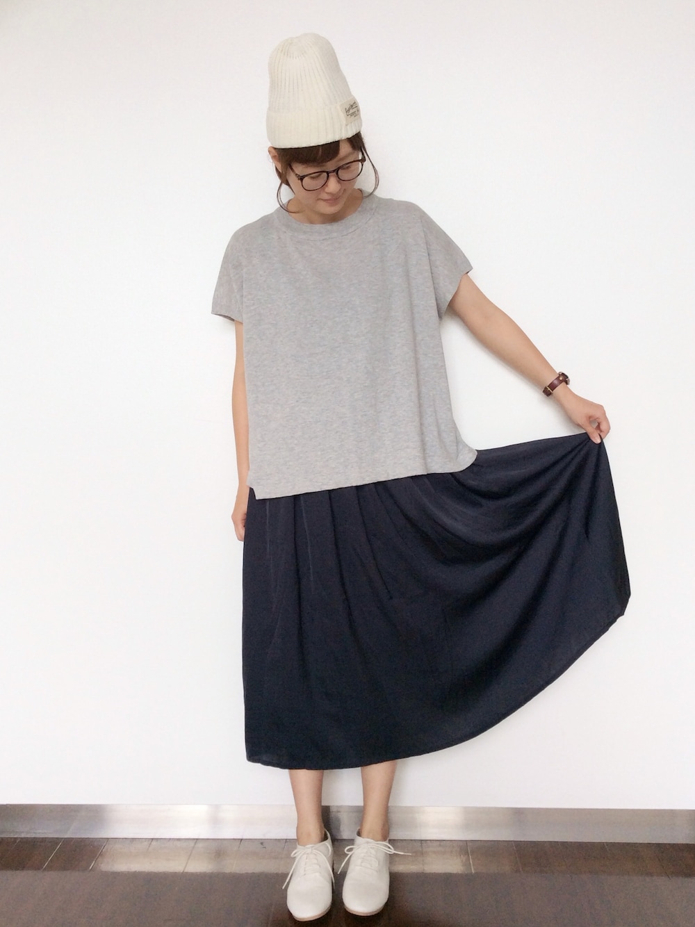 秋らしい上品な光沢感のあるビンテージサテンのスカートです。 ふんわり揺れるシルエットが女性らしい印象に。 ワイドなプルオーバーでゆる+ゆるスタイルにしました!(^^)