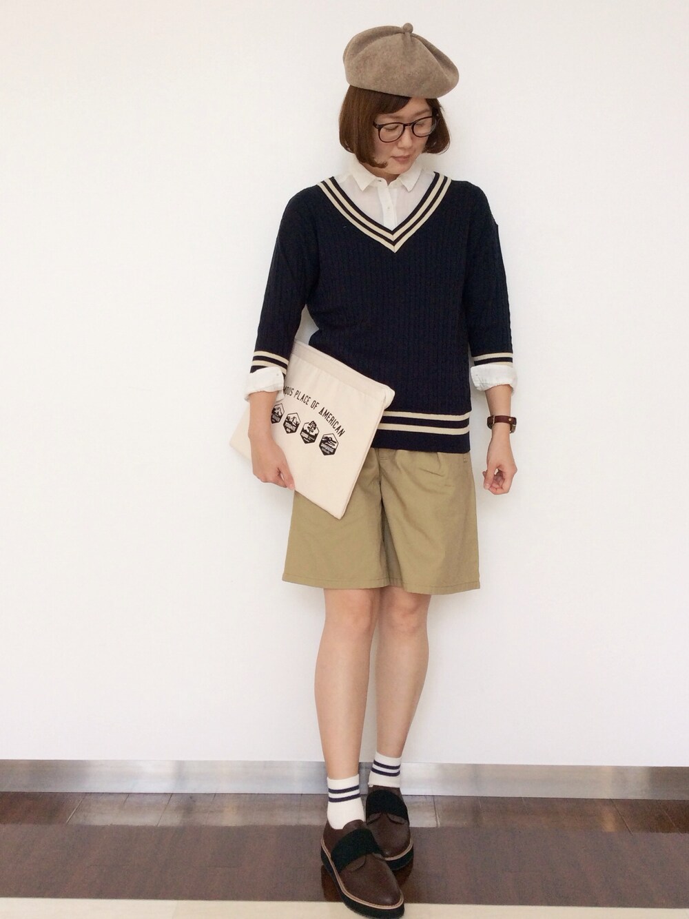 【芸術の秋】をイメージしました。 チルデンニットやキュロット、小物でマニッシュスタイル。チルデンニットは華奢なケーブル編みに手首の見える袖丈なので、あえて白シャツを見せて着るのもいいですね。
